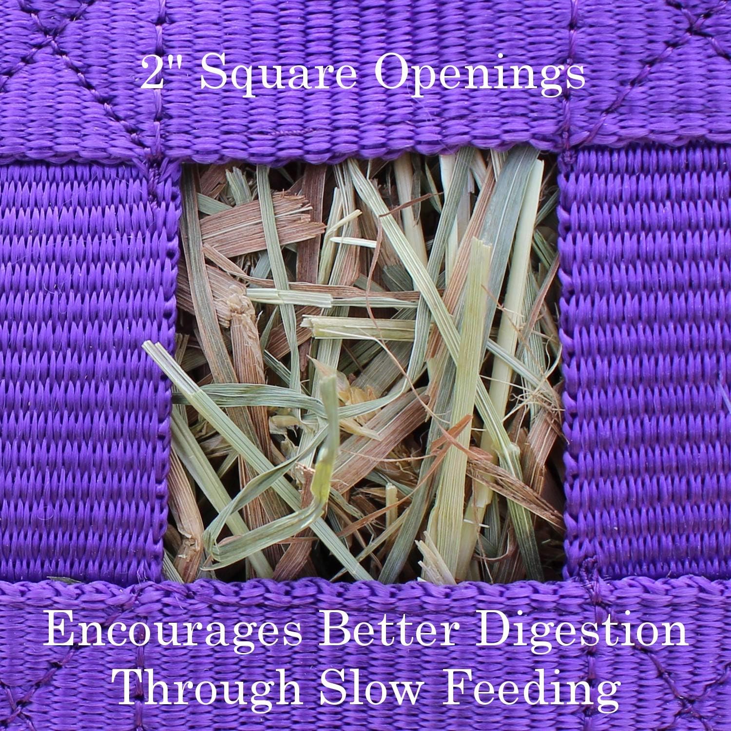 • SUPER TOUGH BOTTOM DESIGN - our exclusive Super Tough Bottom is made of reinforced overlapping nylon webbing. This design allows for superior strength and durability while keeping your hay fresh and allowing dust and debris to exit the bag.