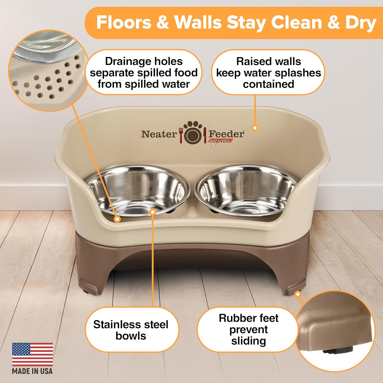 - MESS-PROOF DOG FEEDING STATION: With the Neater Feeder raised dog bowl stand, spilled food is separated and contained at the top of the feeder, while spilled water drains into the catch basin below to keep your feeding area neat and clean.
