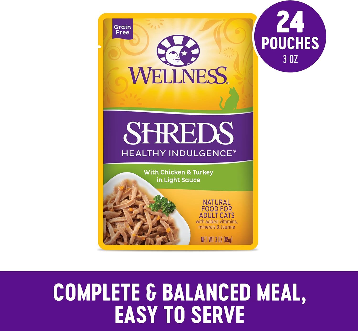 Wellness Healthly Indulgence Shreds Adult Wet Cat Food, Natural, Protein-Rich, Grain Free, 3 Ounce Pouch, 24 Pack, (Chicken & Turkey)