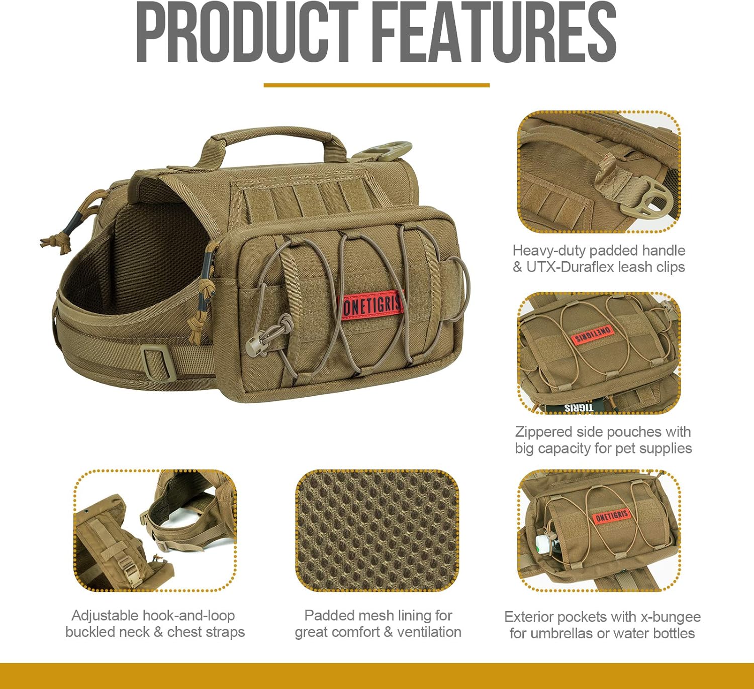 OneTigris Dog Backpack for Medium & Large Dogs, Nylon Backpack for Dogs Tactical Pet Backpack with Side Pockets for Hiking Walking Training Running (Brown, Medium)