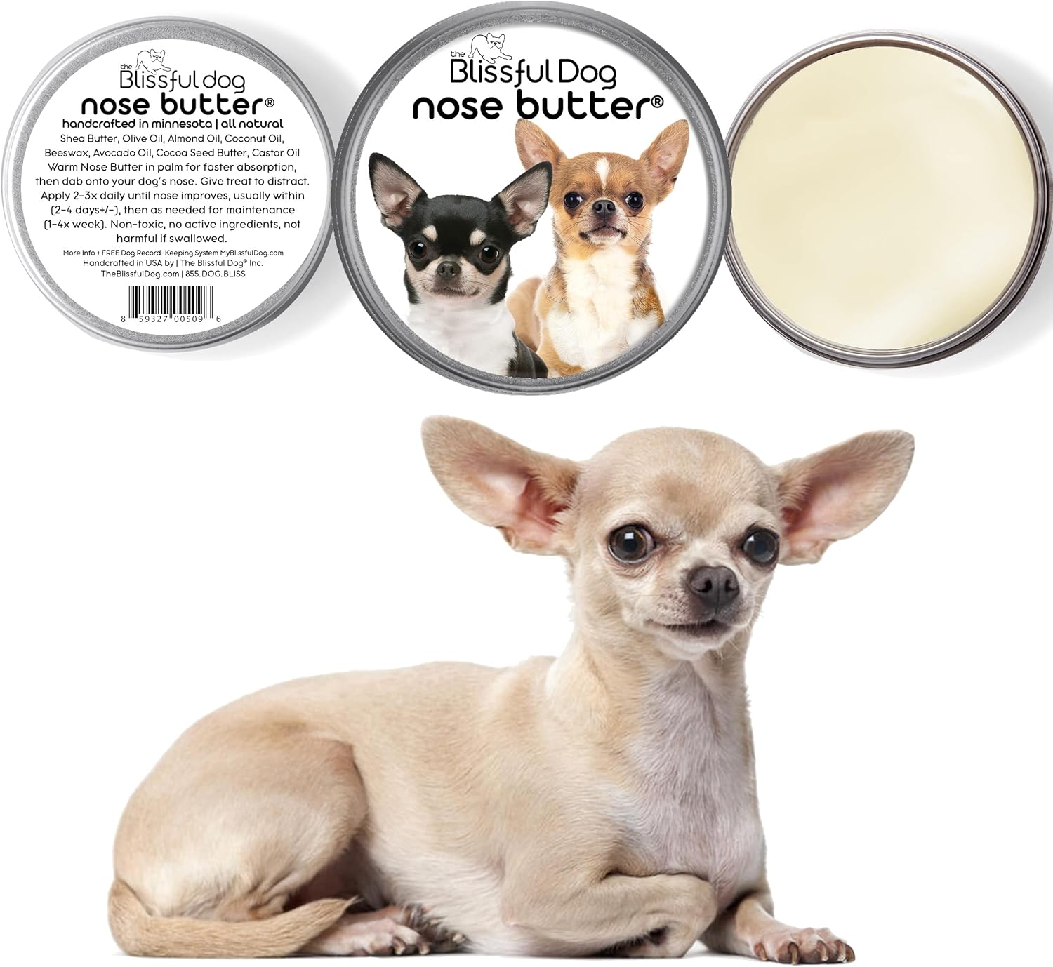 The Blissful Dog Smooth Coat Chihuahua Nose Butter for Dry, Cracked Skin, Lick-Safe Dog Nose Balm with Moisturizing Shea Butter, Almond, Olive, and Essential Oils, Pet Supplies, Uncented, 8 oz.