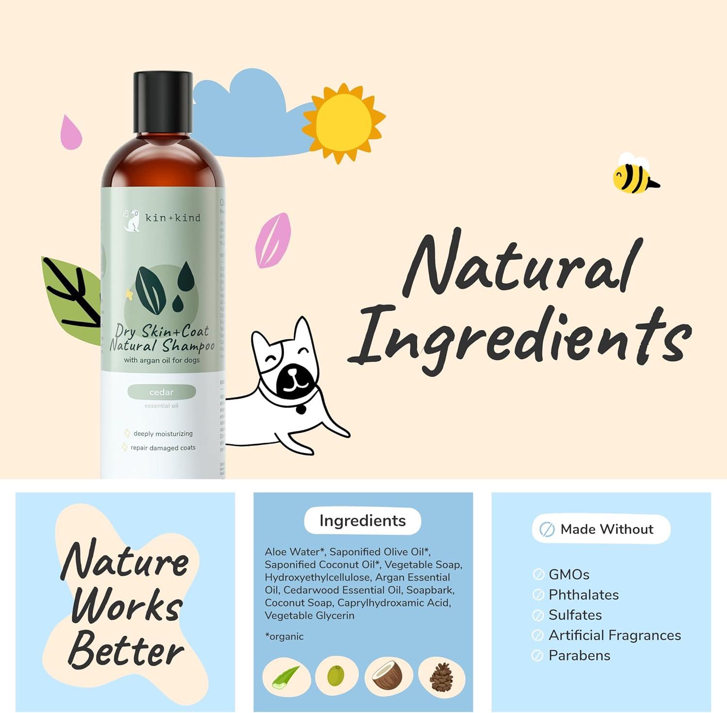 - NATURAL: Our dog shampoo is made with natural and organic ingredients to provide a gentle and effective dry skin and anti-itch cleanse for your pet's coat. We use organic coconut and olive oils as the base of our formula, known for their nourishing and hydrating properties. These oils work together to effectively reduce itching, dry skin, and dirt while leaving your pet's coat soft and shiny.