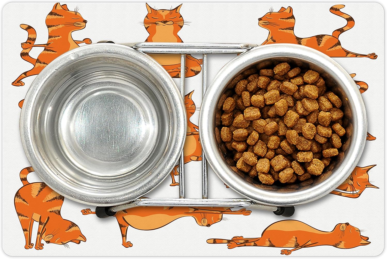 Lunarable Cat Pet Mat for Food and Water, Cats Doing Funny Fitness Exercises and Flexibility Position Sports Stretch Gymnastics, Non-Slip Rubber Mat for Dogs and Cats, 18" X 12", Orange White