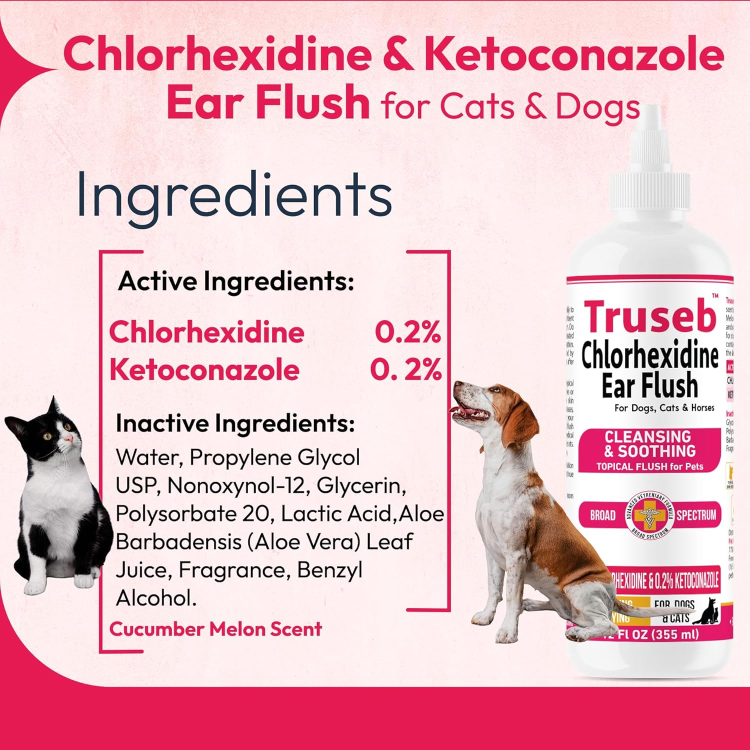- FORMULATED BY VETERINARIAN & PHARMACIST - Truseb Ear Flush for dogs & cats is Vet & Pharmacist formulated with Ketoconazole 0.2% & Chlorhexidine 0.2% . Key active ingredients can help target the cause of cat and dog ear problems.