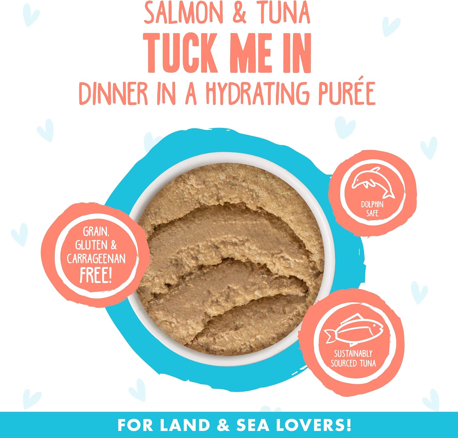 - Salmon & Tuna Tuck Me In (2.8oz Can, Pack of 12) Wild-caught salmon and red-meat tuna gently pureed into a creamy and delicious paté!