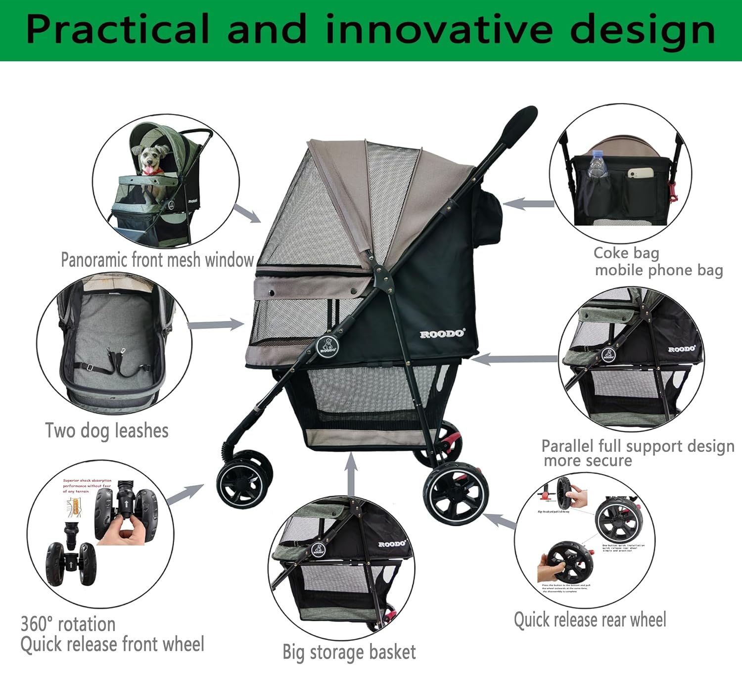 - ROODO Escort 3 Wheel Pet Stroller,have been upgraded front wheel and rear wheels can be quickly installed and removed without tools,The installation of the front and rear wheels will be easier and faster。