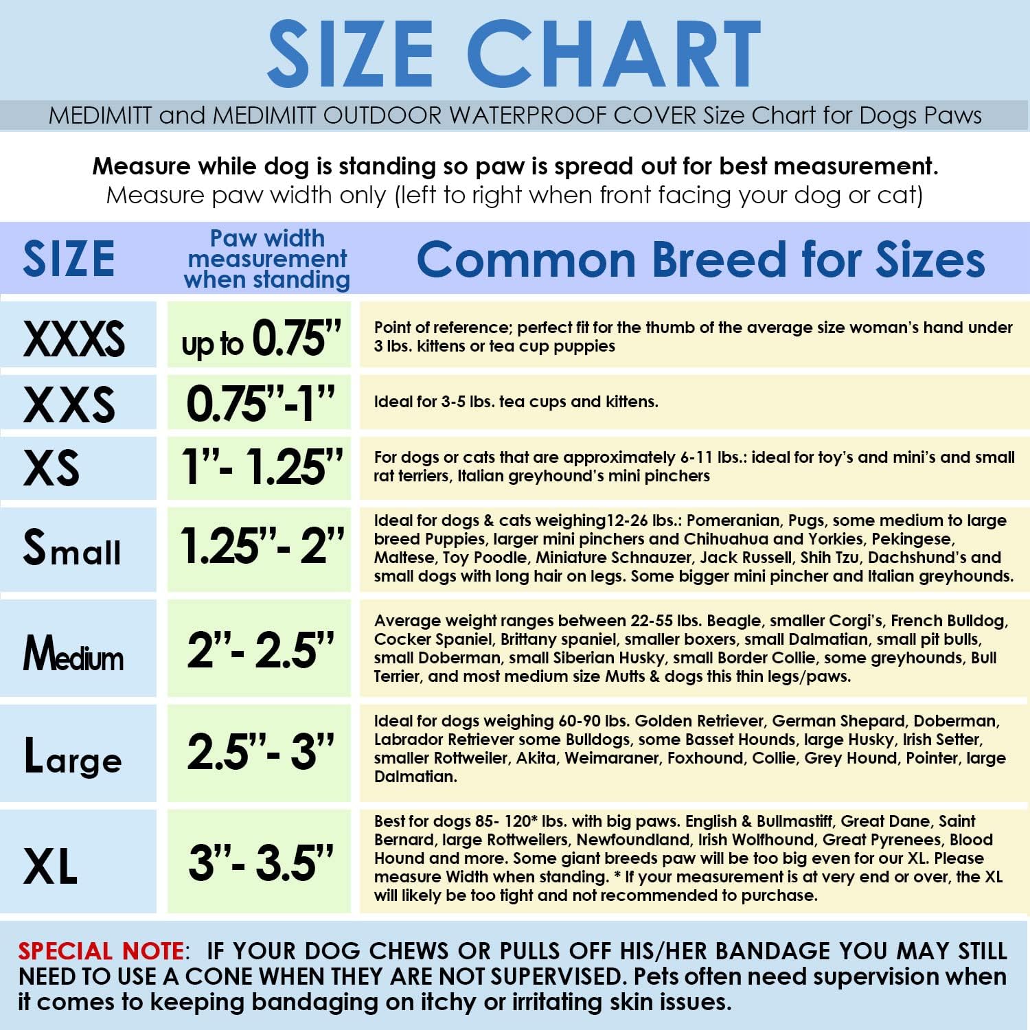 - Size MEDIUM - paw width measurement when standing: between 2-2.50”. Average weight ranges between 20-45 lbs. Beagle, smaller Corgi’s, French Bulldog, Boston terrier Cocker Spaniel, Brittany spaniel, small pit bulls, small Border Collie, , and most medium size dogs with thin legs/paws. IF YOUR DOG CHEWS OR PULLS OFF HIS/HER BANDAGE YOU MAY STILL NEED TO USE A CONE WHEN THEY ARE NOT SUPERVISED.