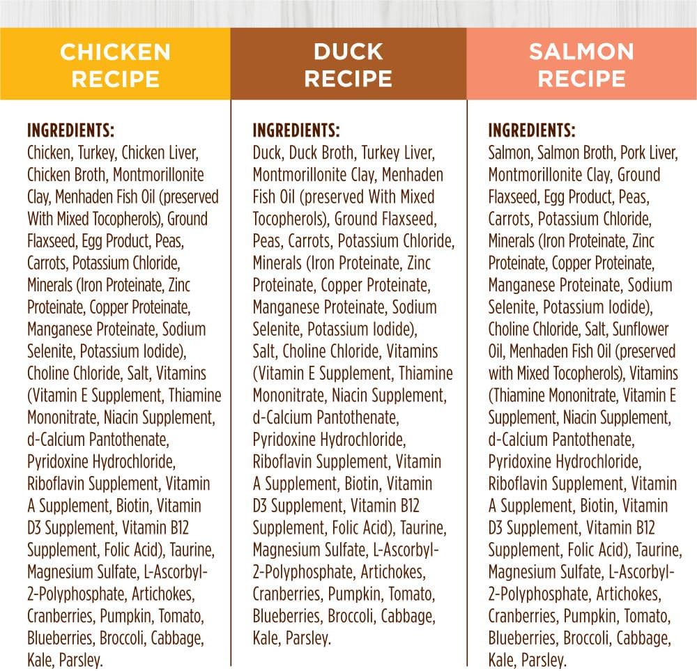 - GRAIN FREE CAT FOOD VARIETY PACK: Each recipe starts with cage free chicken, cage free duck or wild caught salmon. Packed with 95% animal protein for strong, lean muscles and 5% vegetables, fruits and other wholesome ingredients.