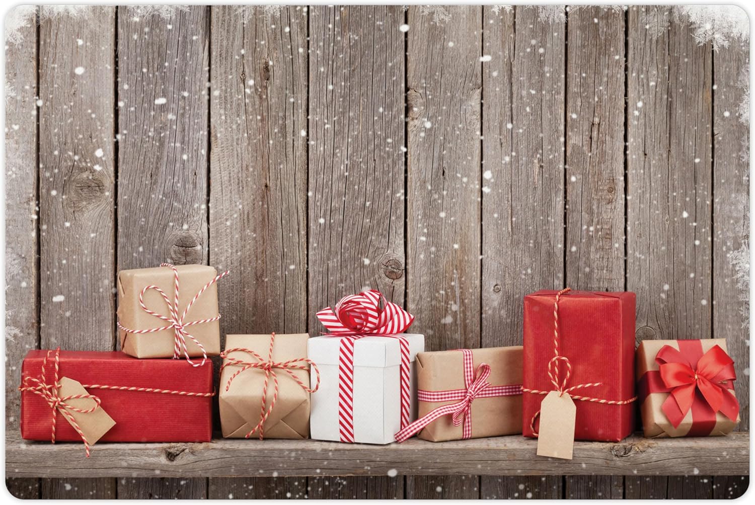 Lunarable Christmas Pet Mat for Food and Water, Concept Photo with Present Boxes Front of Wooden Wall and Snowflake Frame, Non-Slip Rubber Mat for Dogs and Cats, 18" X 12", Burgundy Grey