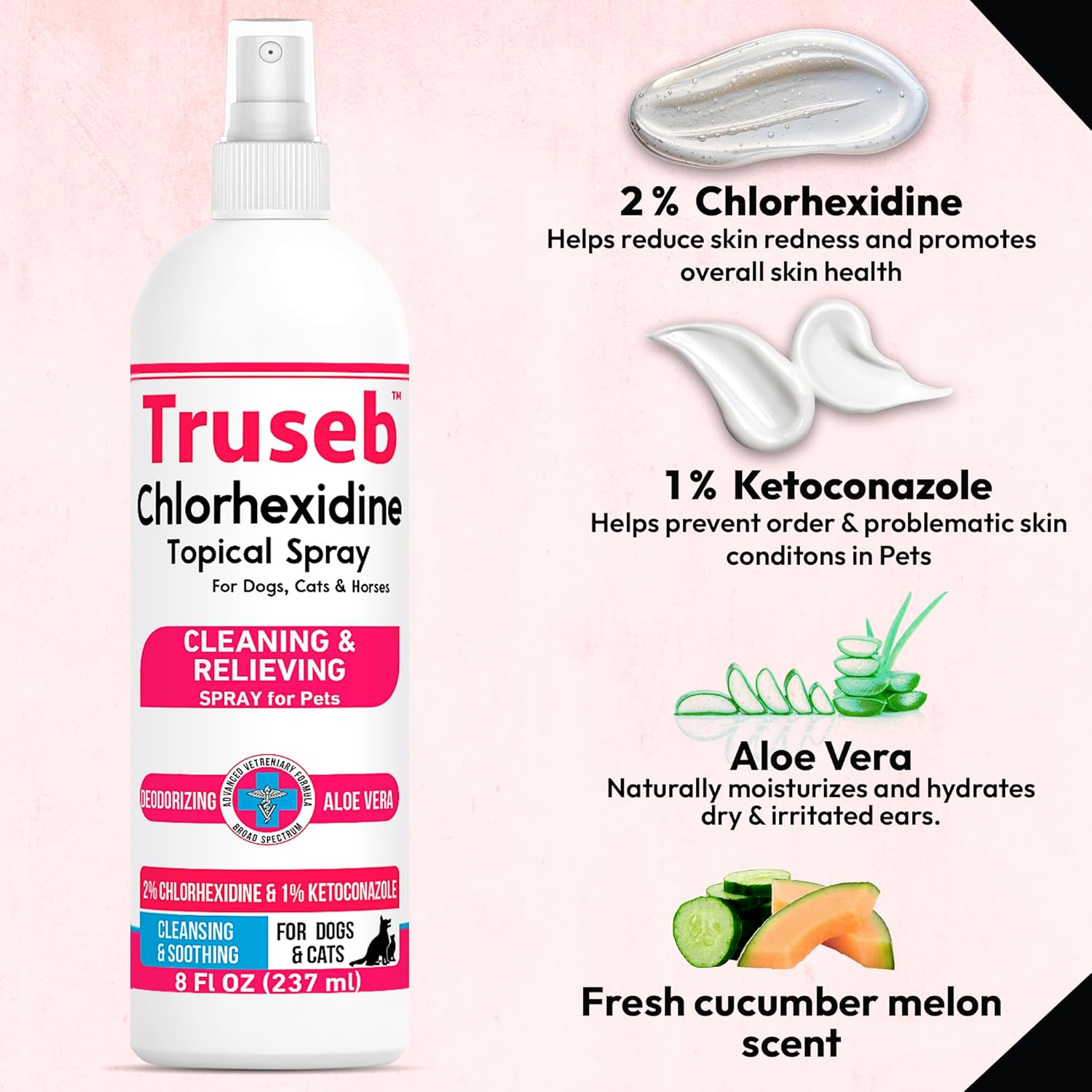 Truseb Topical Ketoconazole and Chlorhexidine Spray for Dogs, Cats, and Horses with Essential Fatty Acids, Aloe and Vitamin E- 16 oz (Ketoconazole & Chlorhexidine Spray, 16 oz)