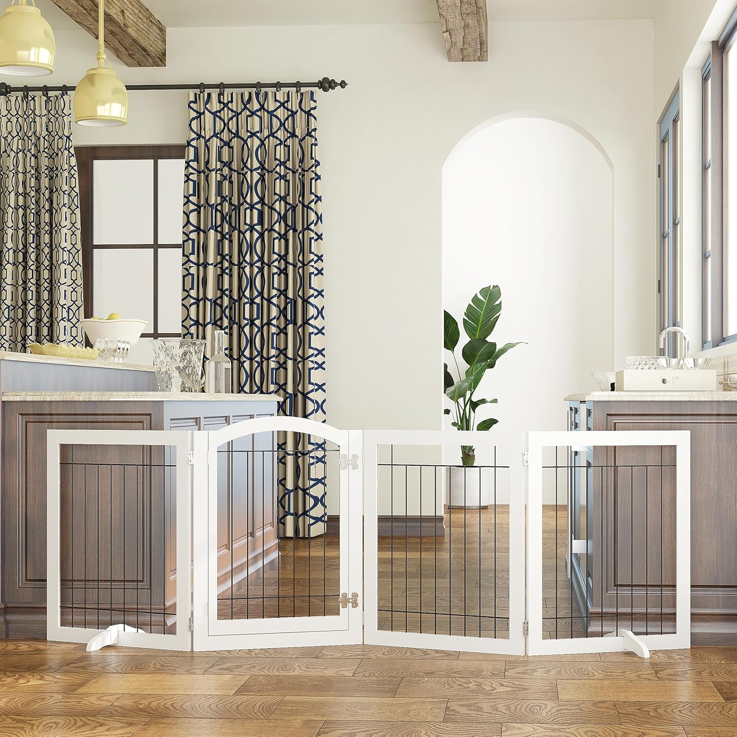 - MULTIPLE CONFIGURATIONS: Consists of 4 Pet Panels, Connected and Secured Together with Sturdy 360 Degree Hinges for Multiple Configurations. Use as A Pet Gate in Doorways Full Hallways or Any Wider Areas, or Connect Together as Playpen, Pet Exercise Pen or Play Yard.