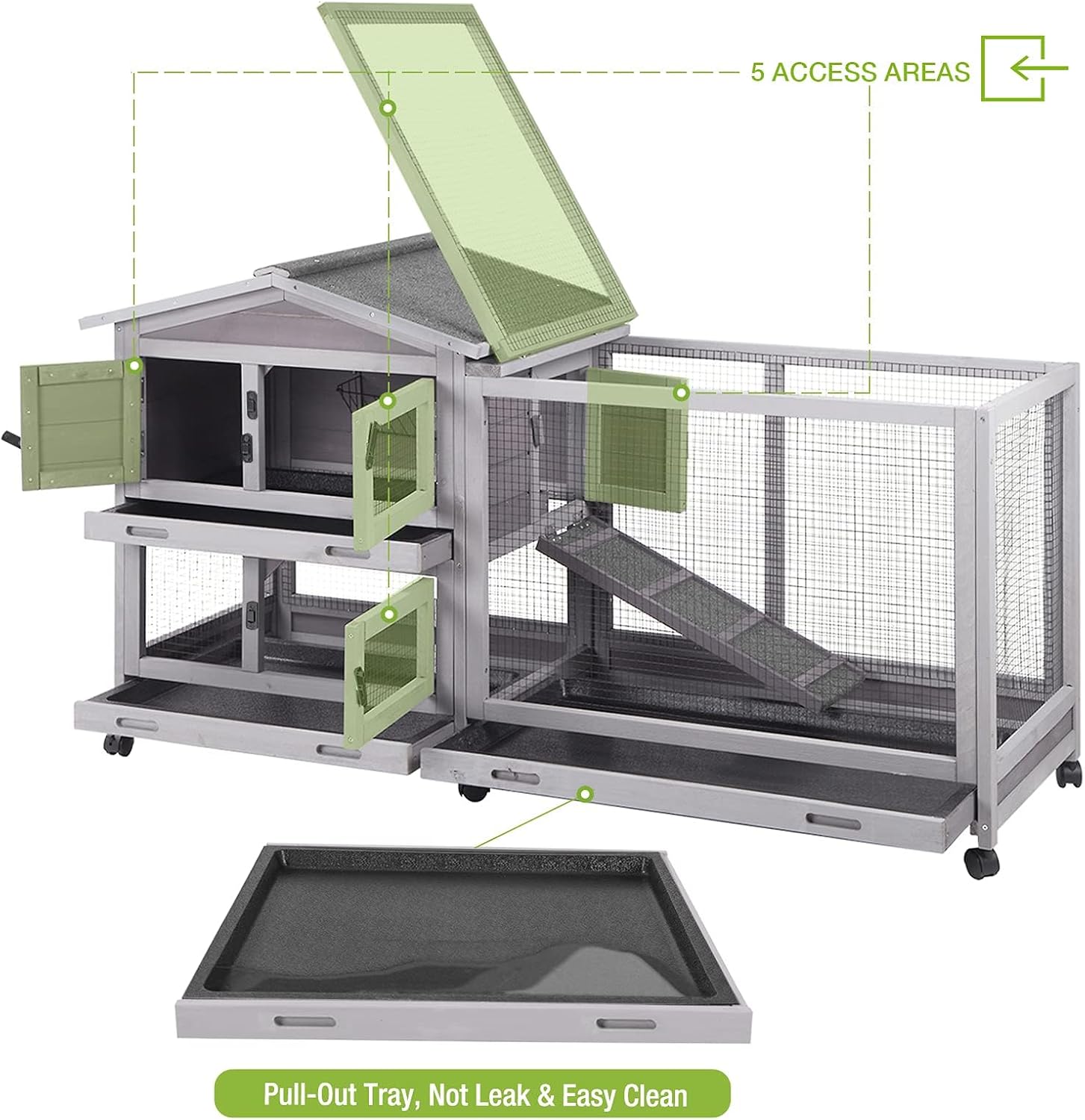 - 【No Leak Plastic Tray】Bunny cage upgrade with thicker plastic no leak removable pull out tray from back and front,easy to clean !Never go mouldy. Product Dimension:61.2"L x 22.6"W x 33.5"H