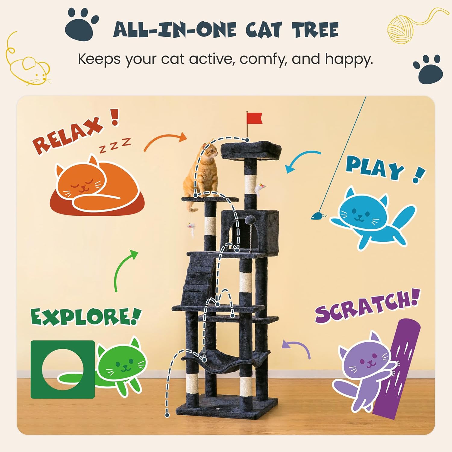 - 【NO MORE SCRATCH!】- The multi-tiered tower replicates the cat’s natural outdoor environment and expends the activity space for cats vertically in your room. Frisky cats can jump from perch to perch and climb to the top of the lookout tower. Carefully placed dangling toys give kitty the thrill of the hunt as she bats them around till her heart’s content.