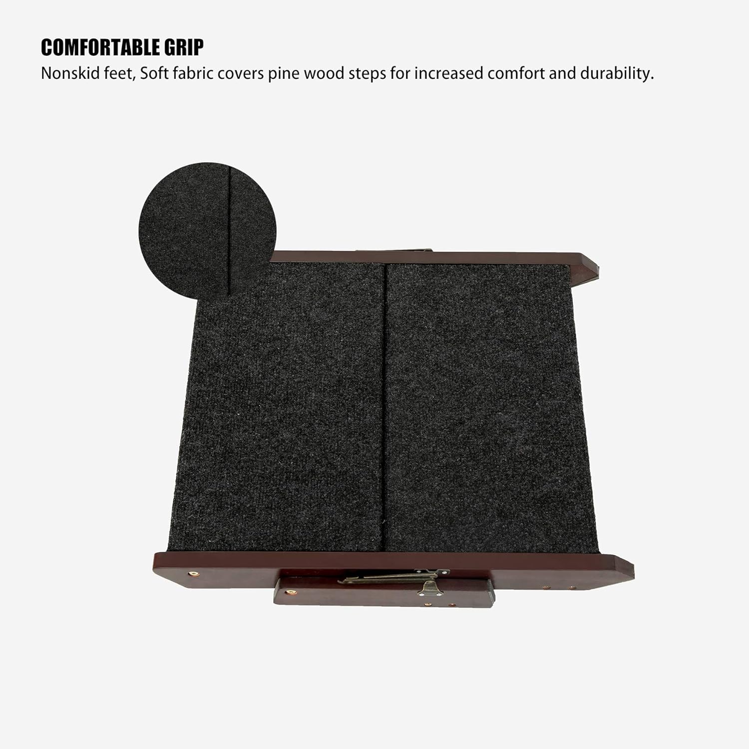- COMFORTABLE ACCESS:Nonskid feet, Fabric covered ramp and stairs provide traction for your pet's paws. The grip carpet is designed to keep your pet from slipping when on the ramp.