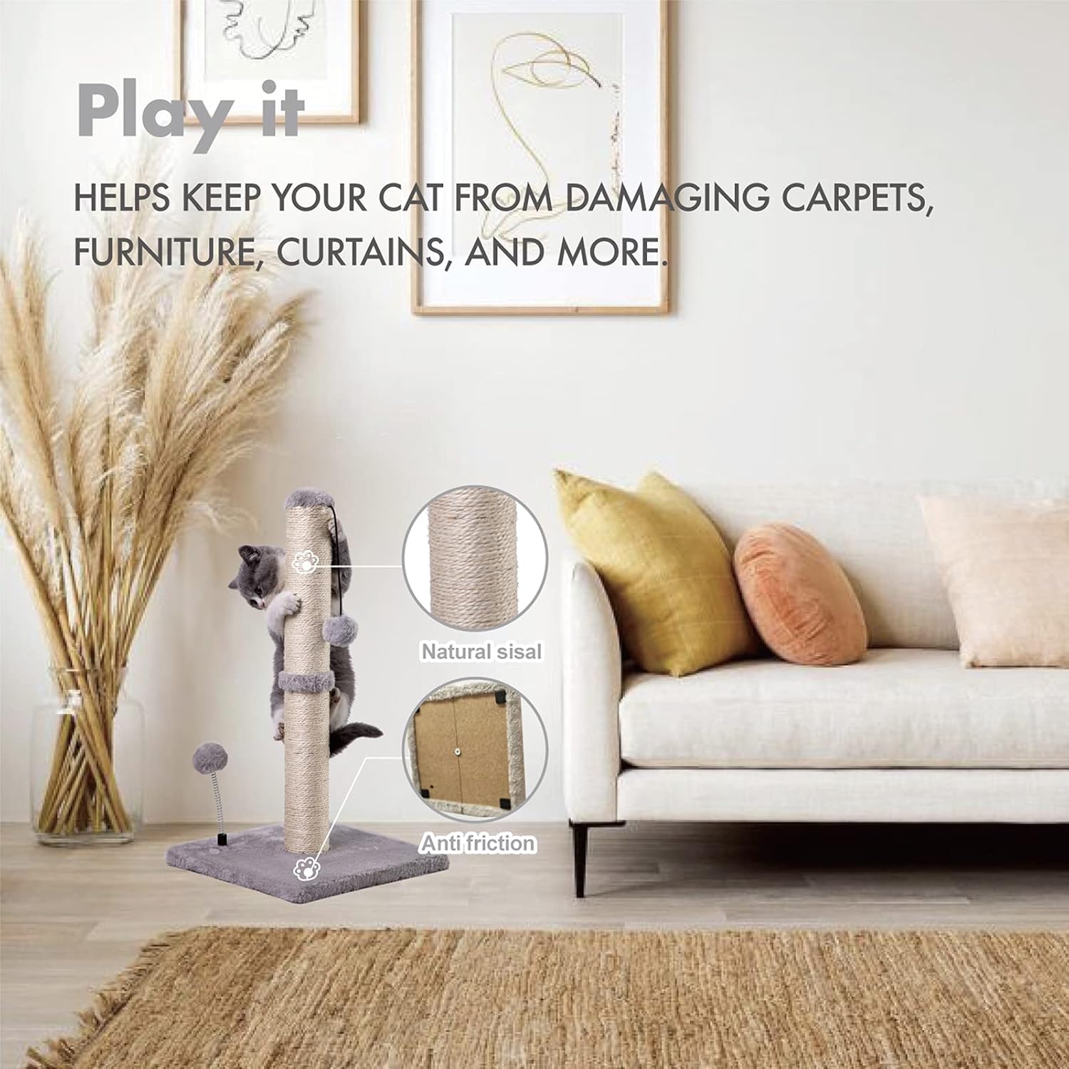 - Protect your furniture - Grab sticks and plush toys combine to attract cats to play and grab, natural sisal is suitable for cats to grab, effectively preventing cats from grabbing furniture.