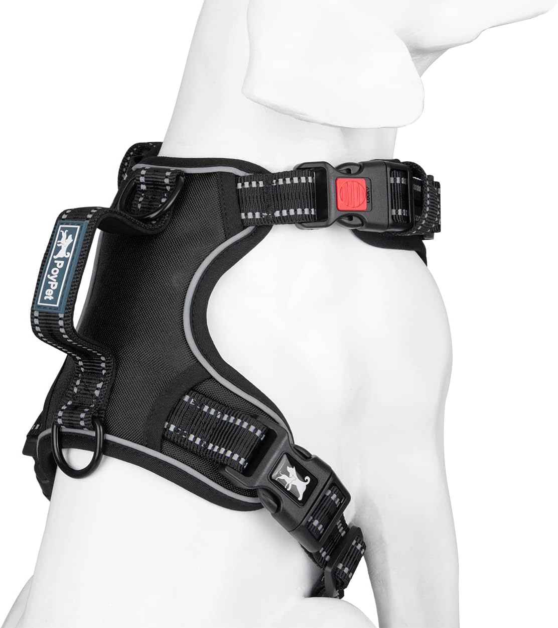 PoyPet No Pull Dog Harness, No Choke Front Clip Reflective Dog Vest with Soft Padded Vertical Handle, 3 Leash Attachments for Small Medium Large Dogs (Black,XL)