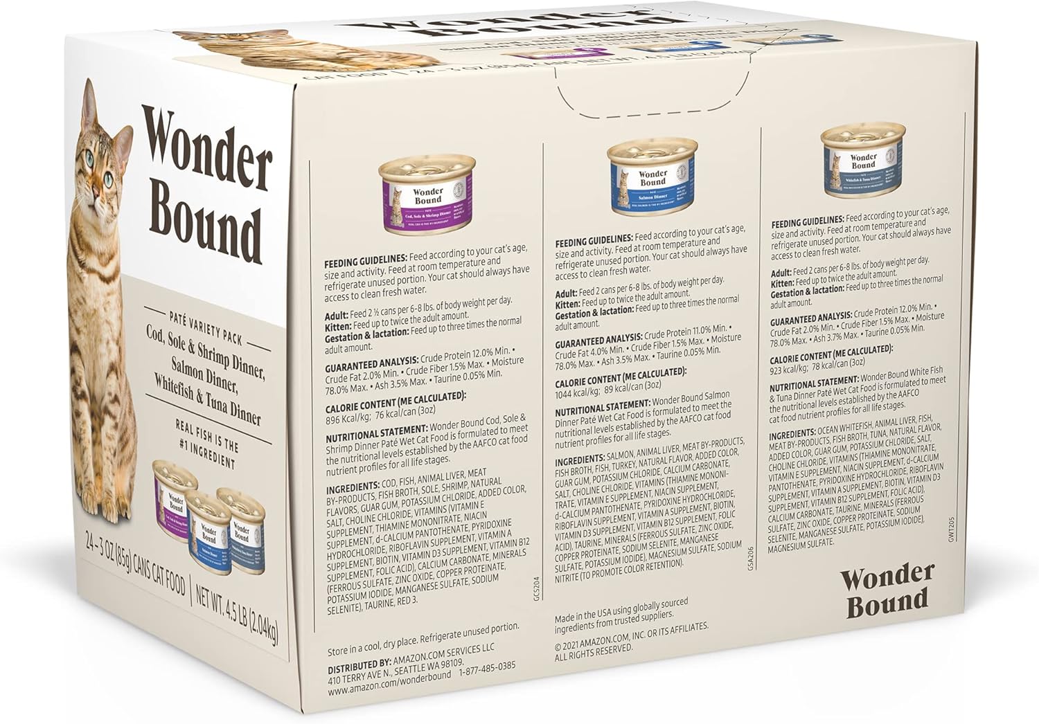 - 24 Pack of Wonder Bound Grain Free Cod, Sole & Shrimp, Salmon, White Fish & Tuna Paté 3 oz cans, Variety Pack Wet Cat Food