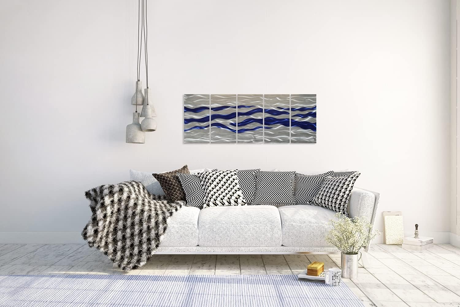 SYGALLERIER Abstract Coastal Metal Wall Art Handcrafted Big 3D Blue and Silver Artwork Modern Sea Waves Pictures Contemporary Sculpture for Living Room Bedroom Bathroom Decor