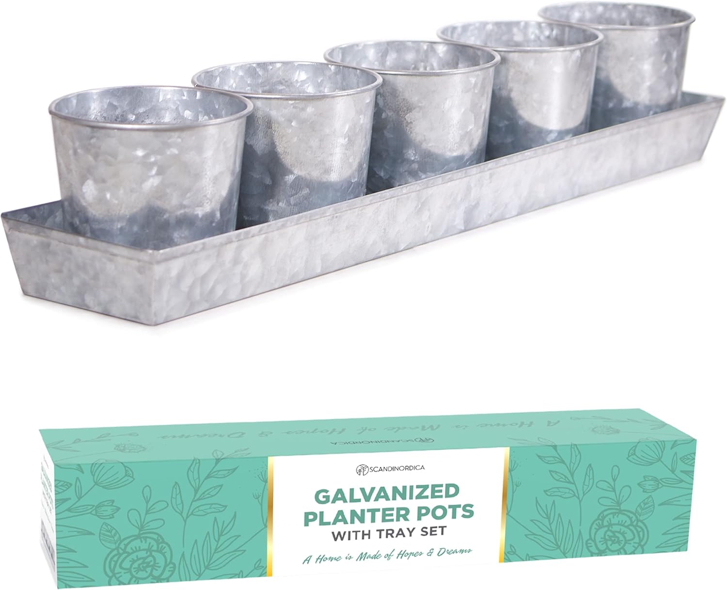SCANDINORDICA Galvanized Metal Herb Planter, 5 Pots with Drainage Holes, Indoor Outdoor Use, Farmhouse Decor, 19.5x3.9x3.5 inches