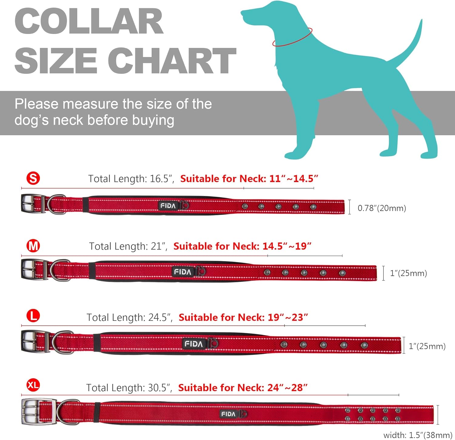 - 【Choose the Right Size】- Please measure your dog's neck before placing an order. Then refer to the sizing chart: Small 11" – 14.5" | Medium 14.5" - 19" | Large 19" - 23" | X-Large 24" - 28" | Do not choose the size by dog's weight or breeds only. Please note: Always allow for adequate breathing room