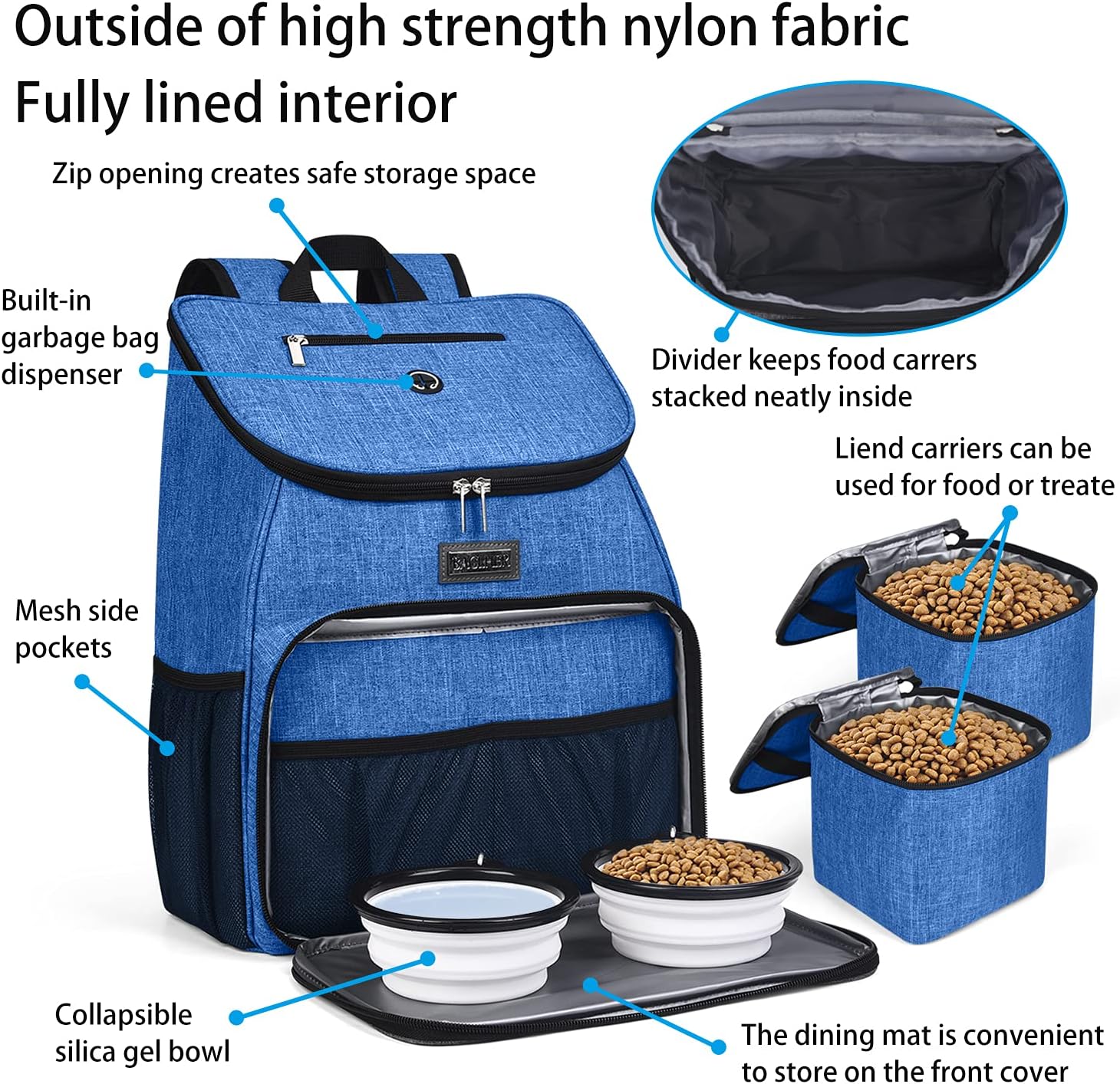 BAGLHER丨Dog Travel Bag, Airline Approved Pet Supplies Backpack, Dog Travel Backpack with 2 Silicone Collapsible Bowls and 2 Food Baskets