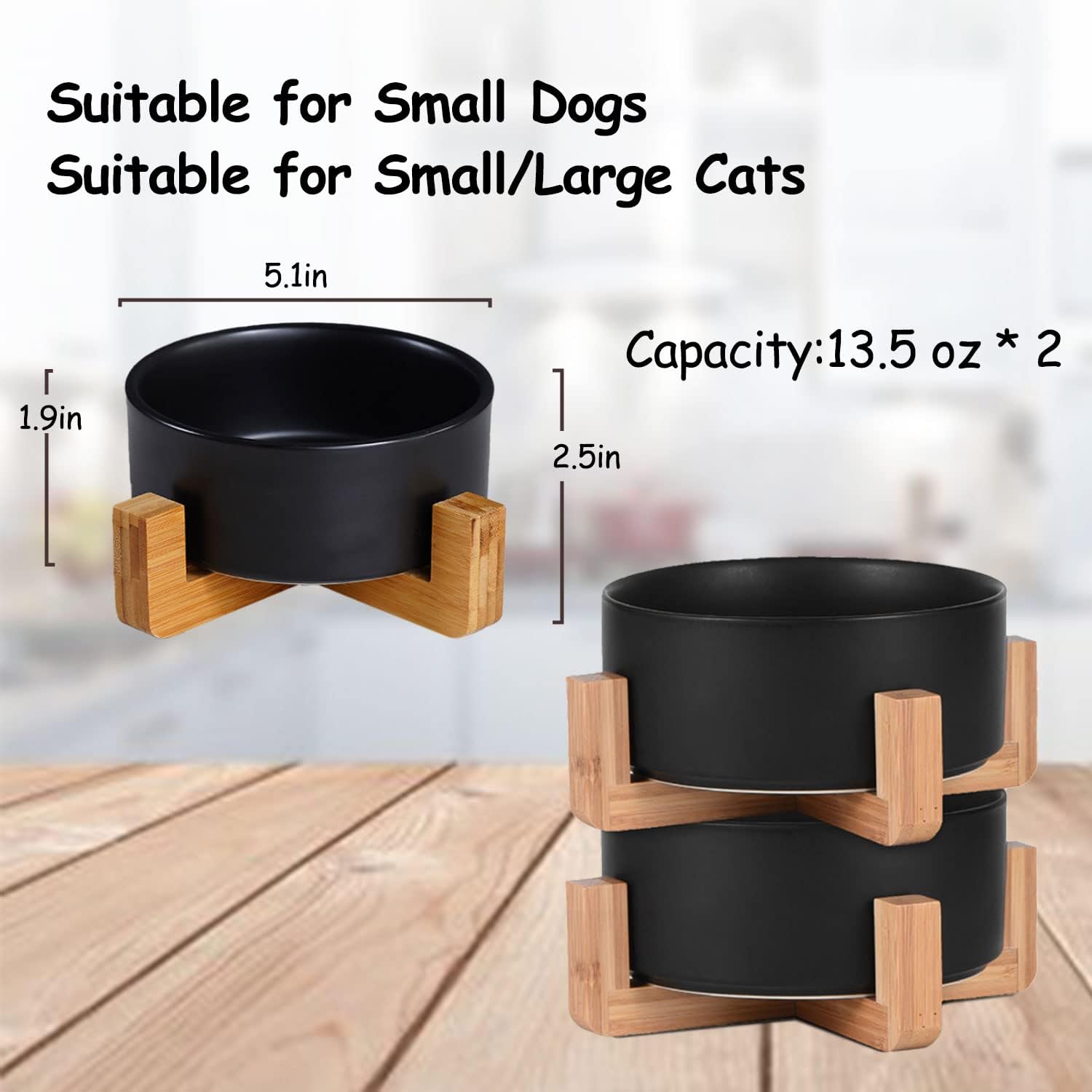 - EASY TO CLEAN CERAMIC - This easy clean dog bowl set is dishwasher proof, as well as easy to handwash and wipe down. With thick walls, these ceramic bowls for pets are sturdy, weighty yet not too heavy. Double Bowl Design:One dog bowl for food and one for water, Each ceramic cat bowl has a Unique wooden stand, raising the dishes closer to your pet for more comfortable eating