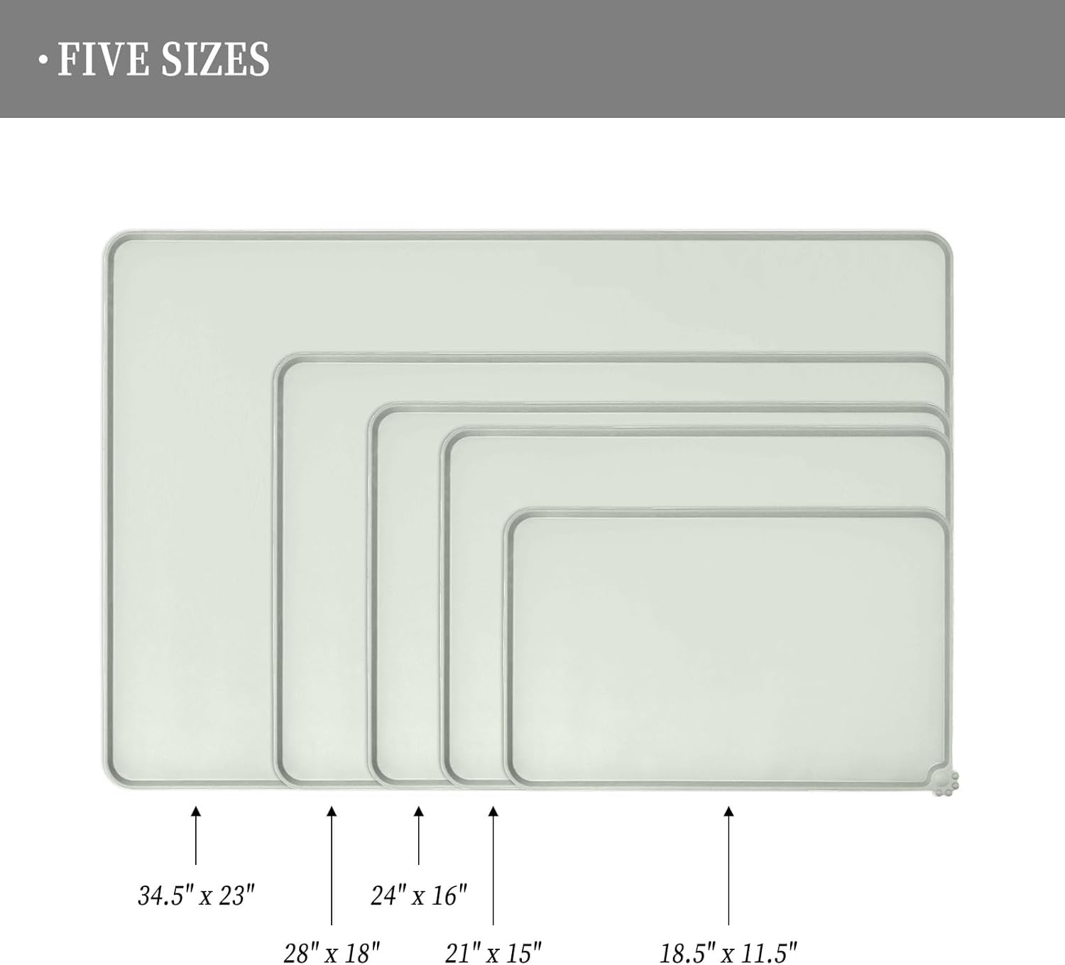 - Various sizes available: our pet mats come in 5 different sizes - 18.5" x 11.5", 22" x 14", 24" x 16", 28" x 18", and 32" x 24". Suitable for all kinds of pets, from puppies to large pets, choose the perfect size for your furry friends and avoid messy spills at mealtime