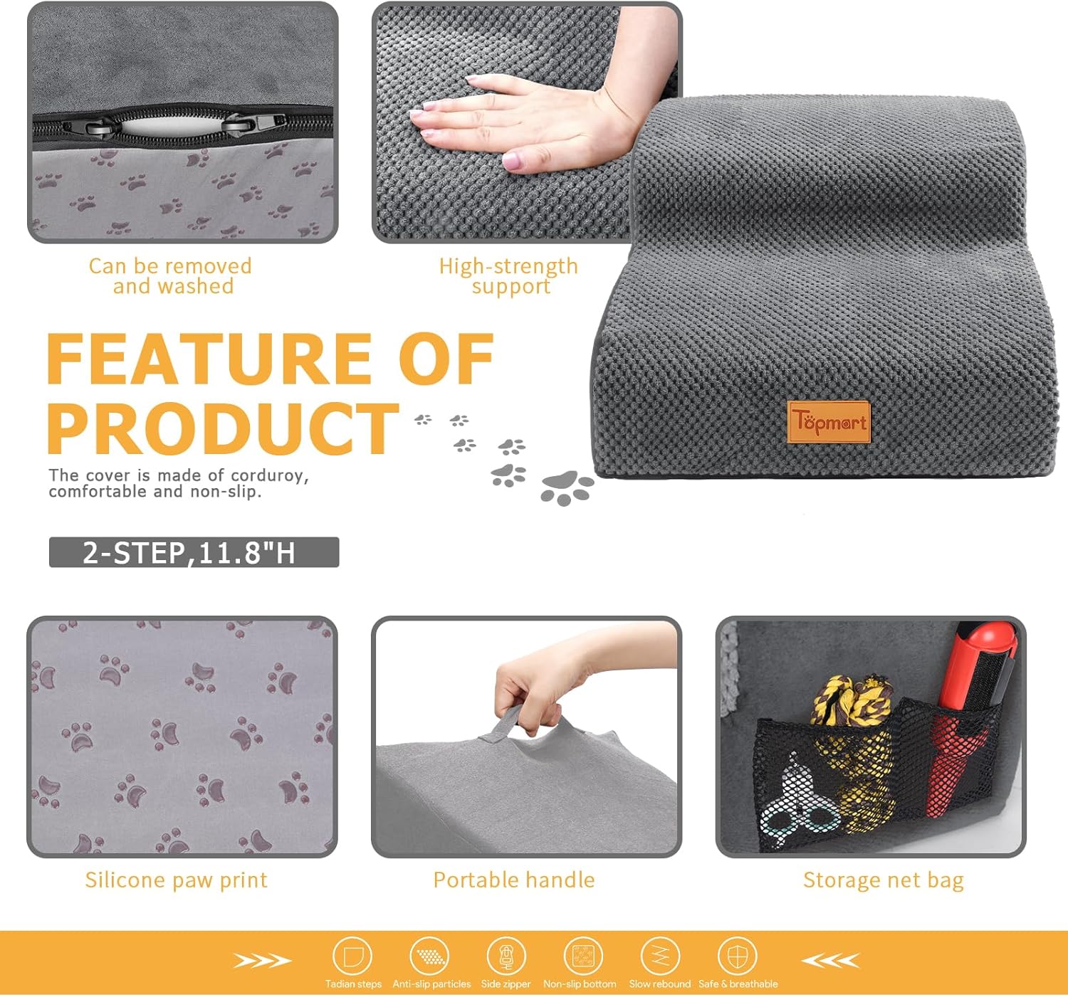 - Safer,Wider&Deeper Steps:Each step is 15.75in x 7.1in.Our dog stairs are excellent for those older dogs who are less mobile as they age or for cats with injuries. More wide and deep steps are helpful for reducing the strain that constantly jumping up and down onto bed,sofa or car can have on your pet's joints,and Topmart dog steps will not shake and slip during use. The cover made of corduroy is more frictional than other covers, pets will not slip on the stairs.