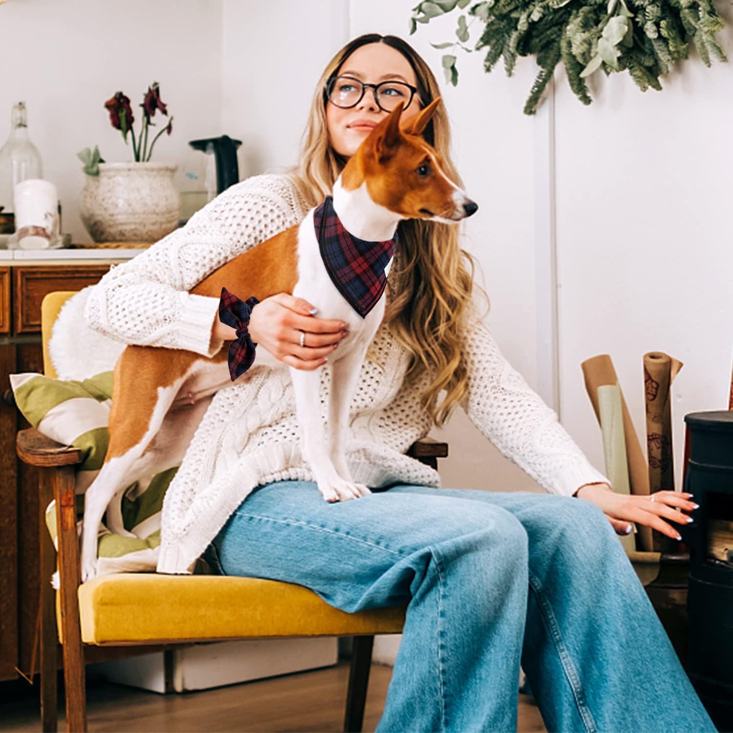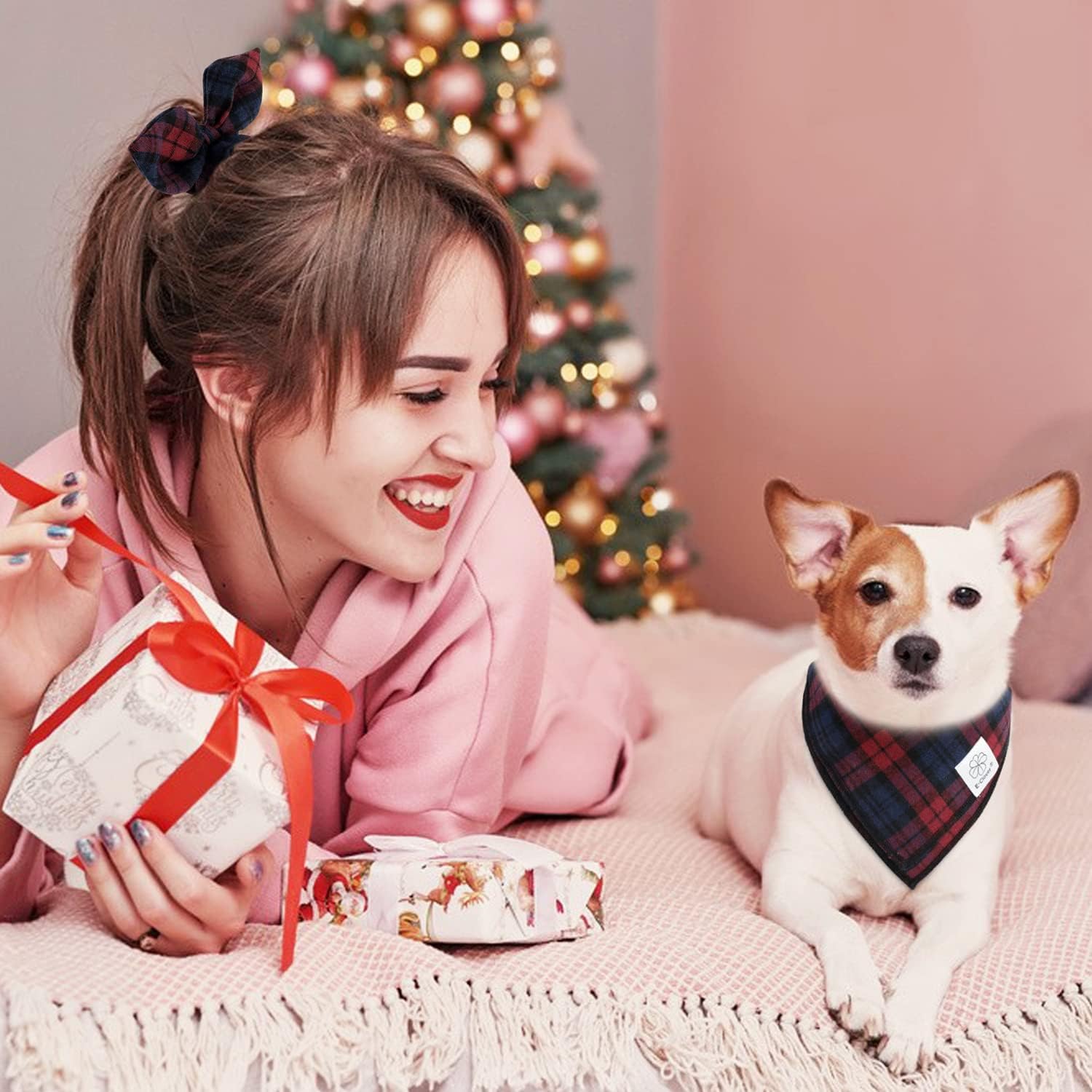 - Matching Bandana and Scrunchie Set - It’s full of love when your pets is wearing the dog bandanas girls and you are wearing the bow scrunchies. When traveling, sleeping, taking photos or daily walking, adorable dog bandana girl and plaid scrunchie is a pretty accessories. The scrunchie can be worn as a wrist accessory and hold your hair. Beautiful dog drool bibs and bow scrunchie with red and blue tartan pattern, it’s nice photo props for holiday.