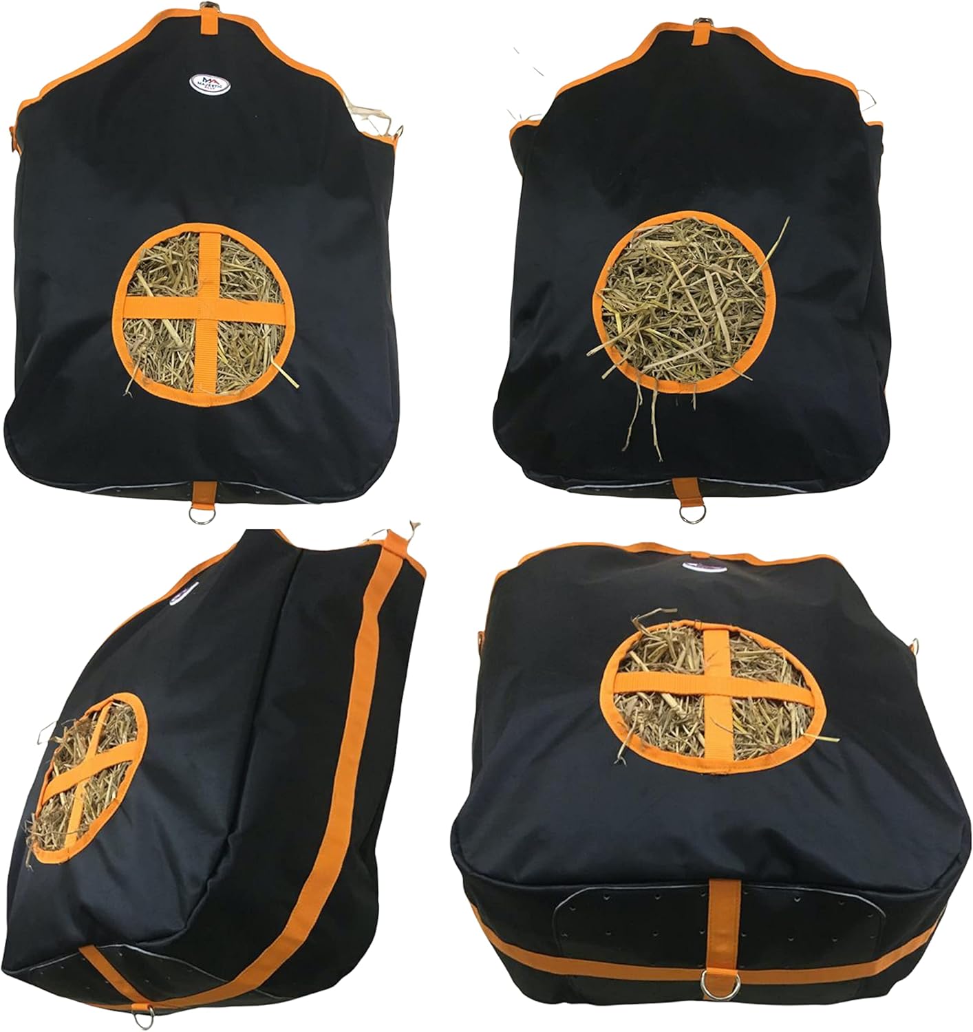 Majestic Ally Nylon Hay Feeder Tote Bag for Horse, Goat, Sheep - Double Sides Open Feed Hole with Faux Leather Ventilated Bottom- Premium Quality -Simulates Grazing - Reduces Waste (Black)