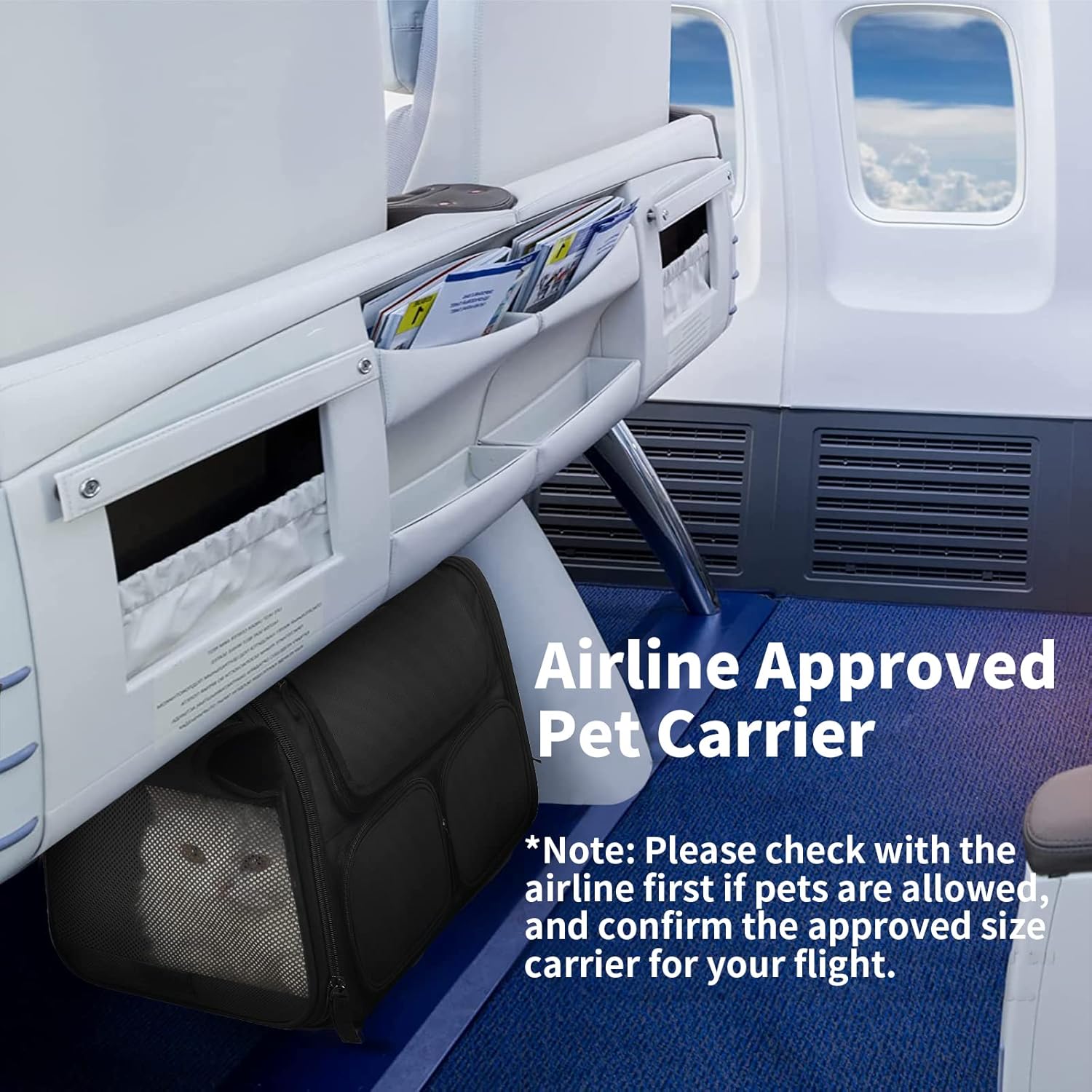 - Airline Approved Pet Carrier - Accepted by most airlines, and designed with a Ventilated Top to meet all airline regulations, so your furry friend can safely lie under the seat in front of you during your trip. Carrier Bag measures 17.5"L x 11.8"W x 11.4"H. Please check with the airline first if pets are allowed is necessary, and confirm the approved size carrier for your flight.
