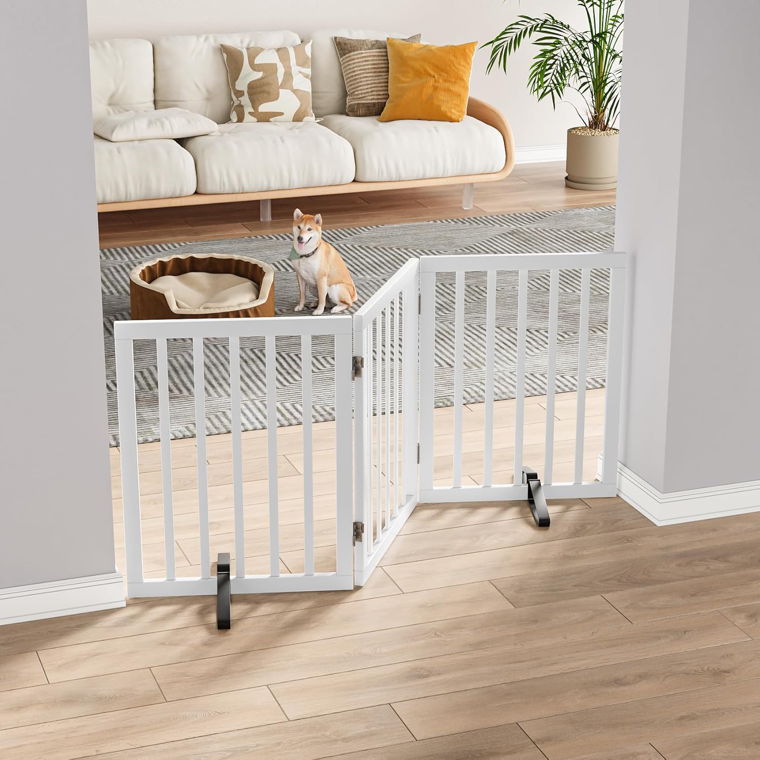 - FOLDING AND EXPANDING DESIGN: This pet gate is stand alone, no-drill, and features a 360-degree hinge design that allows you to fold it into a wide z shape or temporarily enclose it into a square fence. The wide slats of doggie gate for indoors provide a secure barrier without making your pet feel like they are completely isolated from your home