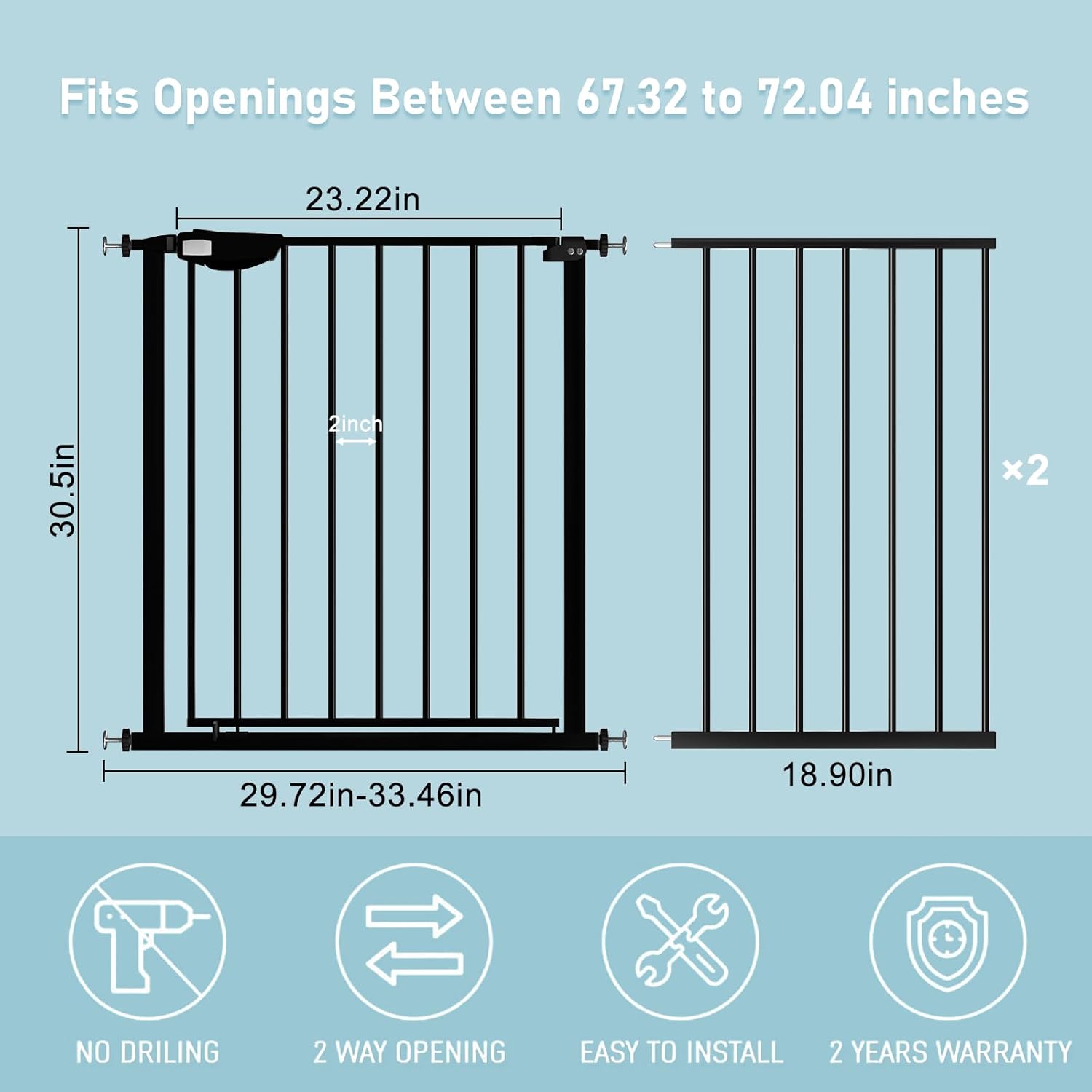 WAOWAO Triple Lock Baby Gate Extra Wide 67.32-72.04" Pressure Mounted Walk Through Swing Auto Close Safety Black Metal Dog Pet Puppy Cat for Stairs,Doorways,Kitchen