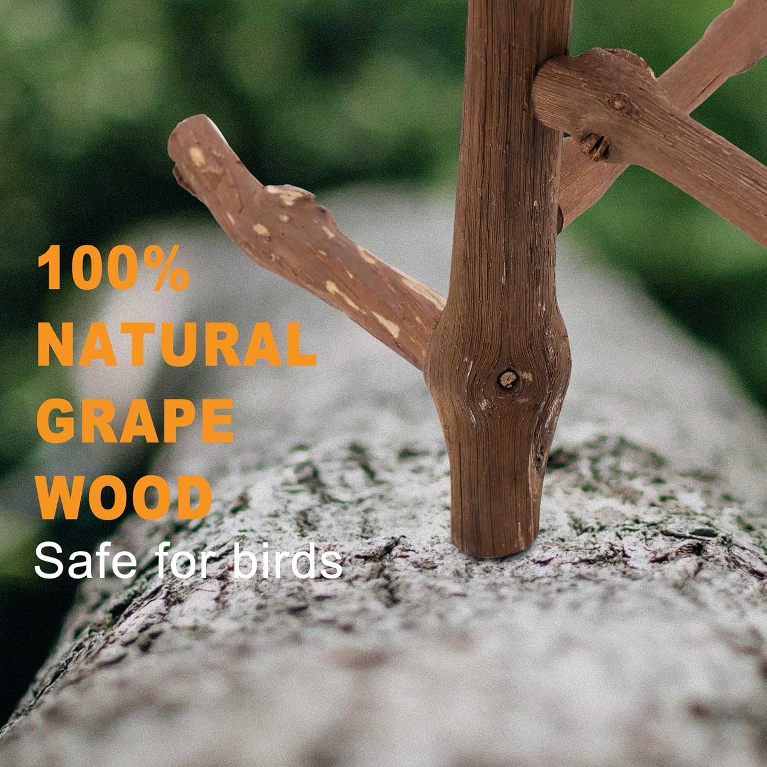 - MATERIAL: Parrot perch stand toys are made of 100% natural grape vines which is safe for you pet chewing and playing. Rough surface gives your bird a comfortable controlled grip, provides excellent foot exercise and nail trimming without hurting bird's feet.