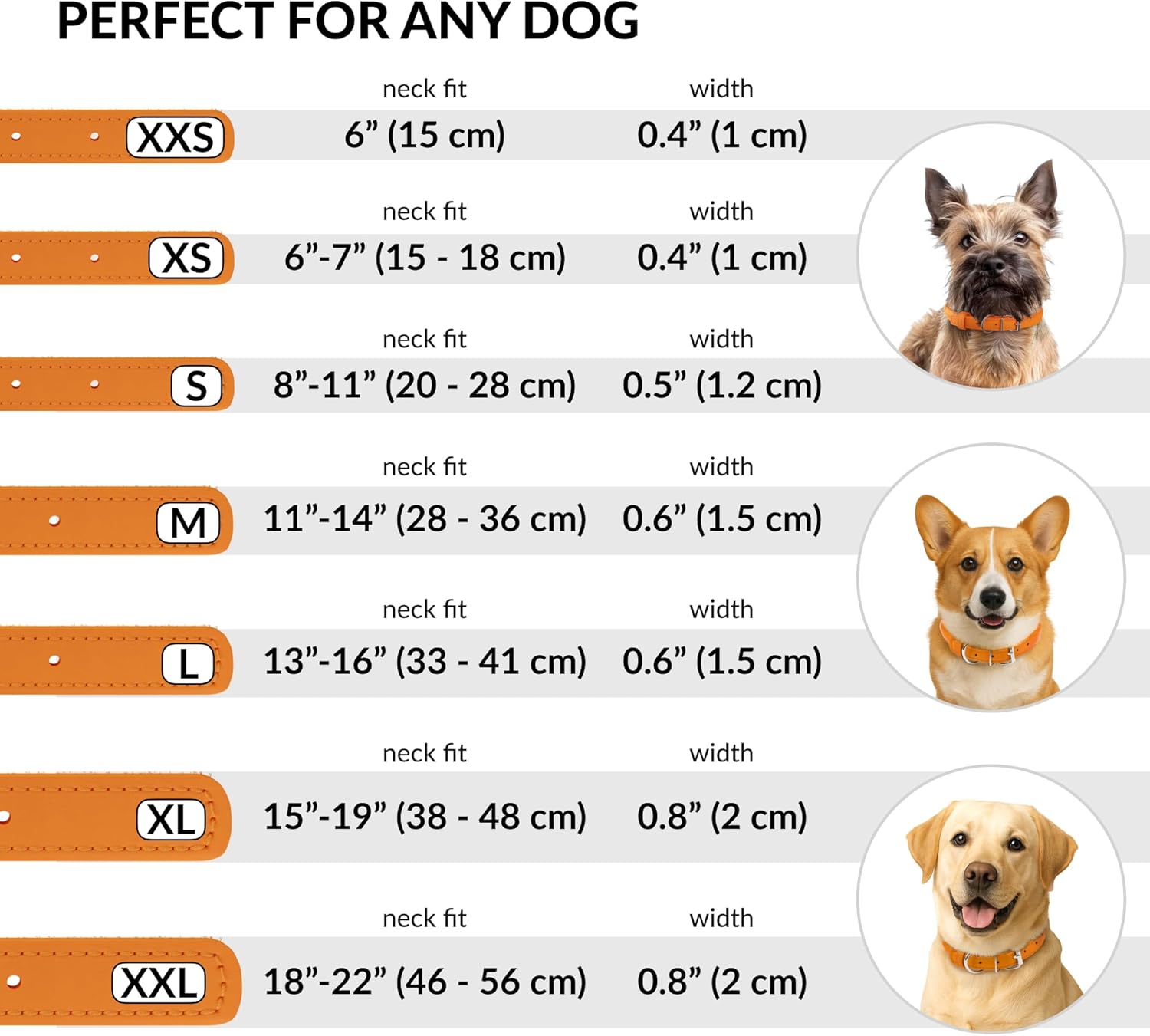- SUITABLE FOR ALL BREEDS: Our dog collars for small dogs and big dogs come in a variety of sizes. Please check out our size chart before purchasing a leather collar for dogs. The dog collar leather is 0.4 inches wide, 10 inches long, and neck sizes of 6 - 7 inches.