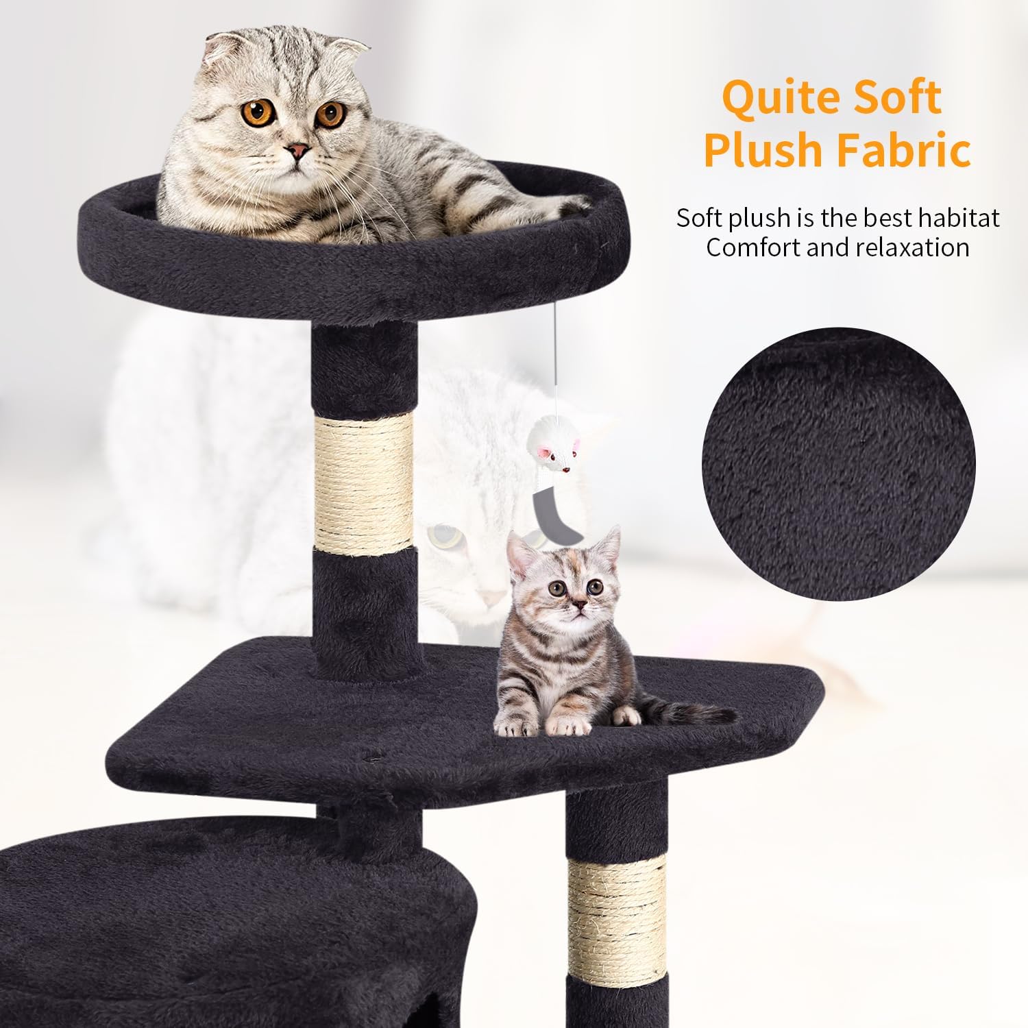 - 😸【Multifunctional Activity Place】The cat house provides one independent platform and a large roomy condo. Whether your kitten wants to stretch out on a spacious perch, curl up in a plush hole room, or release the urge to scratch on a sisal pole, this multifunctional cat tree tower can make your fur baby's day full of fun and excitement!