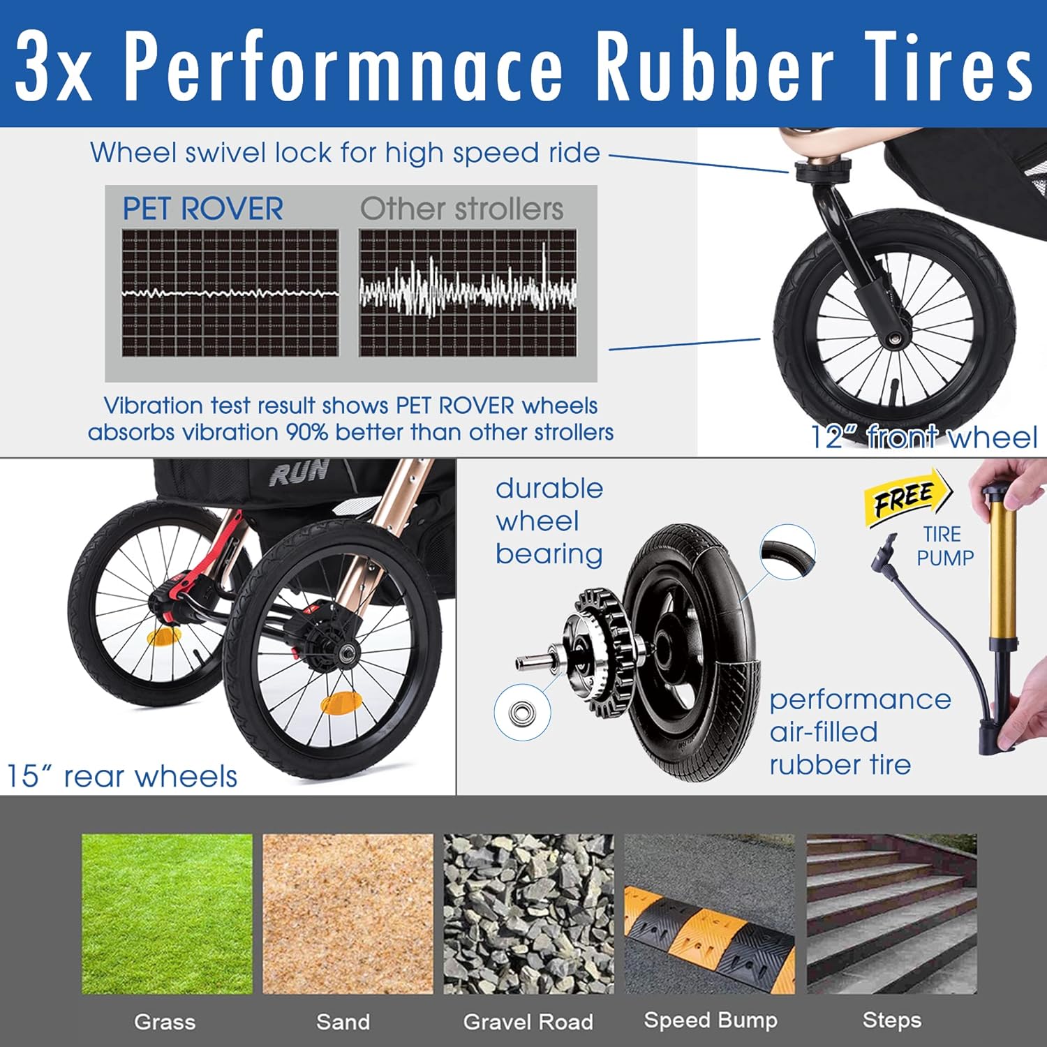 - 3X PERFORMACE RUBBER WHEELS โ All three durable and durable automotive-grade air filled rubber tires offer excellent stability and superior ride quality for speedy travel on all terrains. Highly maneuverable front swivel wheel with swivel locks of the front wheel enhances stability even on rough terrains. The oversized rear wheels add comfort and stability for jogging and running. A free tire pump is included