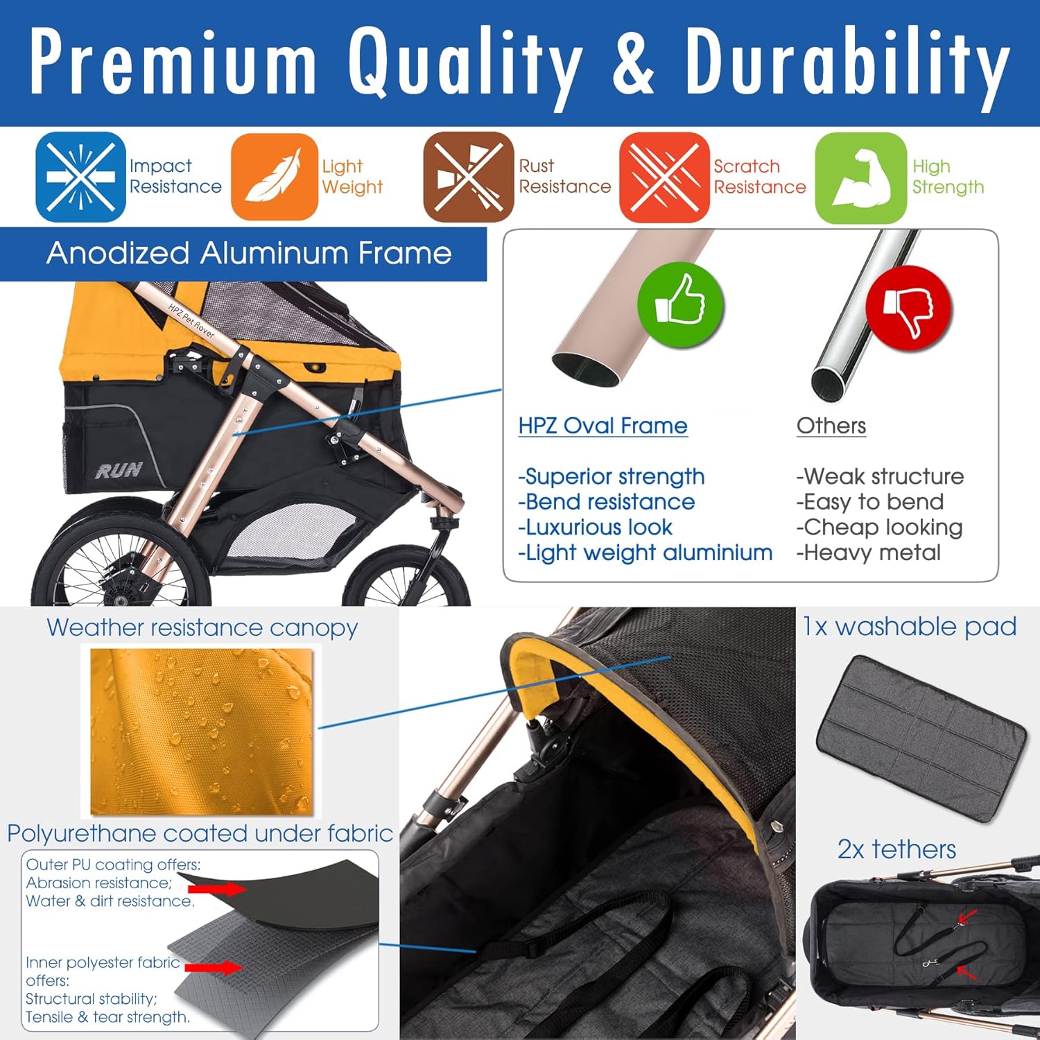 - LIGHTWEIGHT & DURABLE โ Rigid yet light-weight frame offers strong construction using anodized aluminum alloys in luxurious gold color, this rust-free metal makes for an extremely durable product. It also includes machine-washable carrier pads and durable water-resistant fabric