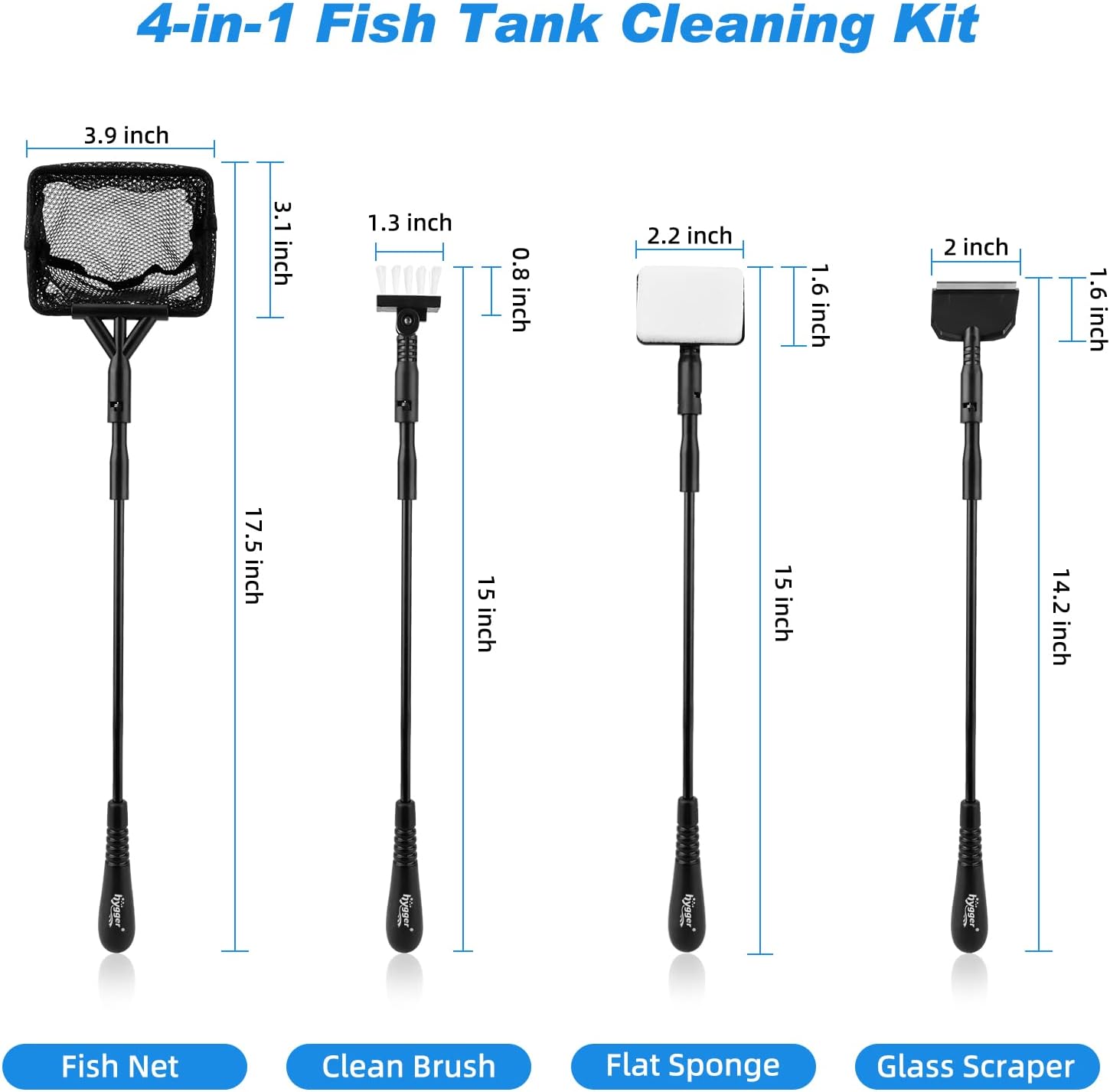 - Multifunctional 4 in 1: Aquarium cleaning kit includes 1 handle, 1 scraper, 1 small fishing net, 1 right angle sponge brush, 1 wall brush. hygger small fish tank cleaner kit can do a basic fish tank cleaning job. It is an indispensable tool for all small aquariums