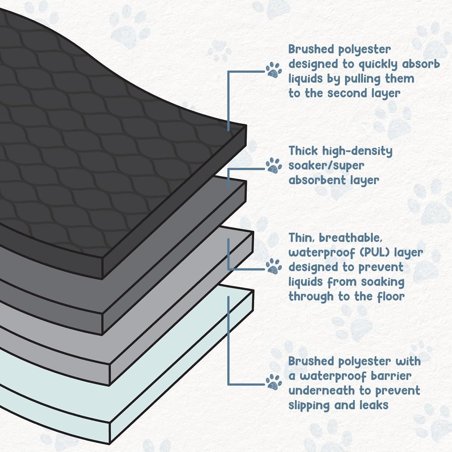 - HIGH-QUALITY PET PEE PADS: Our dog pads are crafted with durability in mind and are OEKO-TEX Standard 100 certified. They feature a highly absorbent, waterproof, and washable design. The slip-resistant silica paw prints on the bottom keep them securely in place on clean, hard surfaces, and the soft brushed polyester on the top ensures comfort during use.