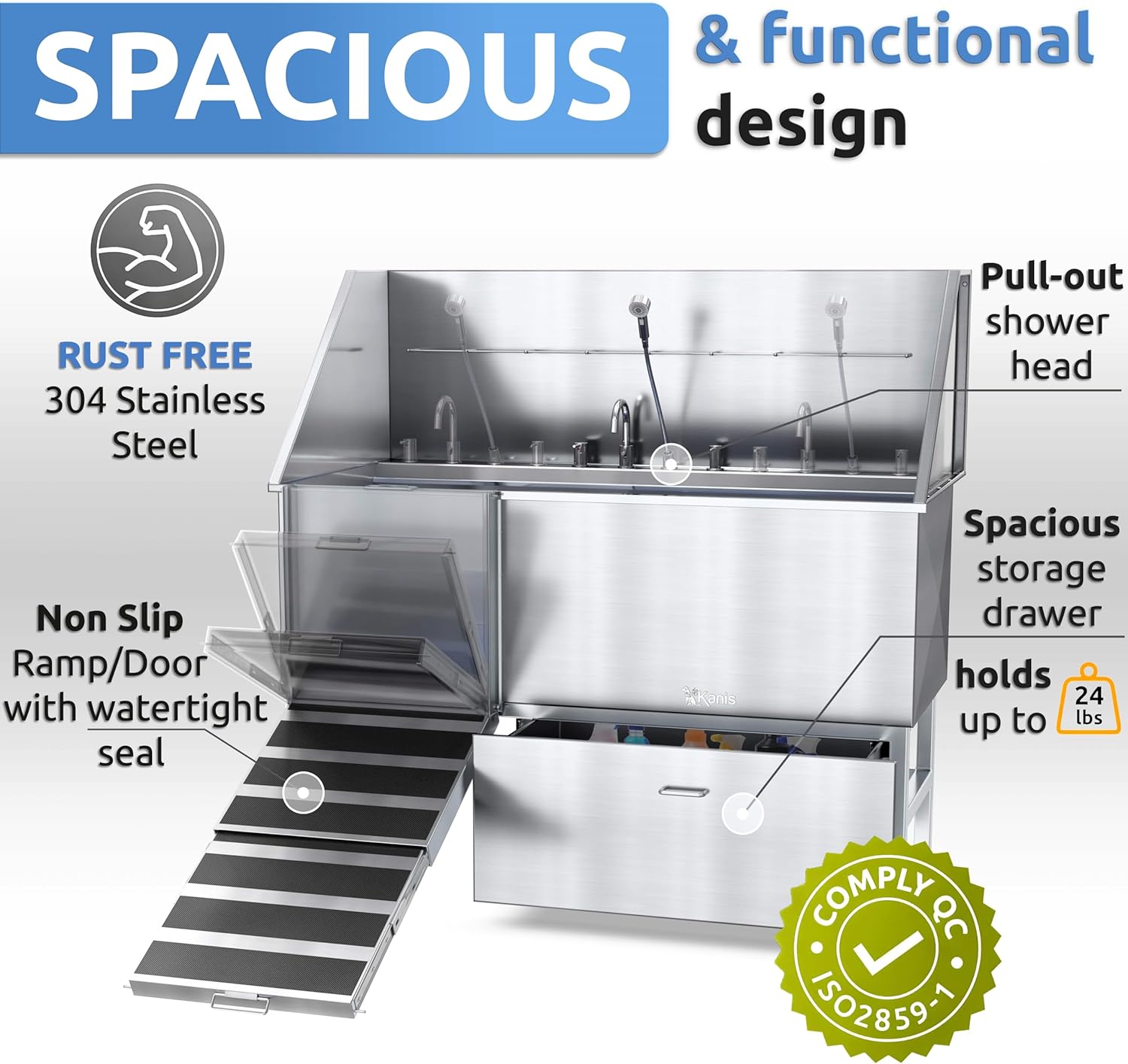 KANIS Professional Dog Washing Station - 304 Stainless Steel Pet Wash Sink & Grooming Bath Tub for Home with Ramp, Shower, Floor Grate, Storage Drawer, Faucet, Drain Kit for Large, Medium & Small Pets