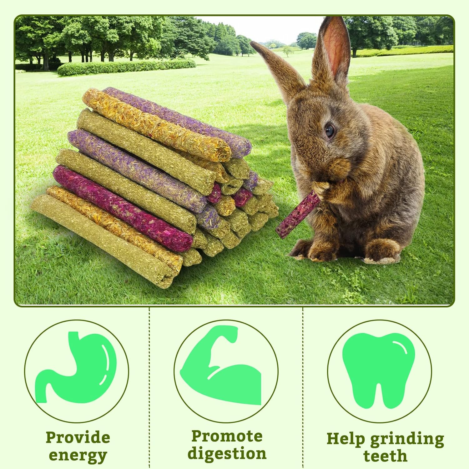 - ๐ฐ [Variety Of Taste]: Package contains 50 pcs timothy grass sticks, 18 pcs mixed petal grass sticks, a total of 68 PCS delicious small pet snacks, enough quantities to let your furry friends enjoy the joy of chewing!