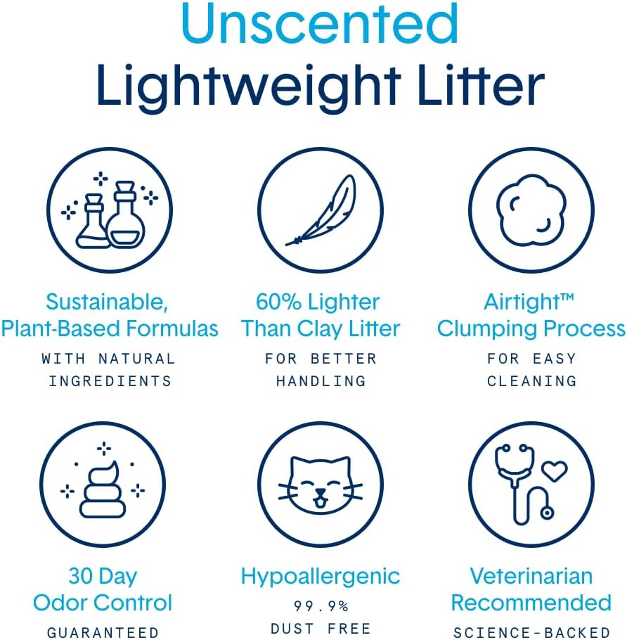 - EASY TO POUR & EASY TO CLEAN: 60% lighter than clay litters, making it easy to lift, pour and store. Clumps form instantly on the top of the litter box, rather than sticking to the sides or bottom. Non-stick for easy scooping & cleaning throughout the month.
