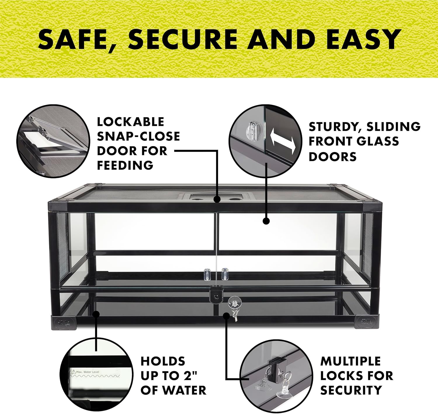 - EASY ACCESS TO YOUR PET. Zilla QuickBuild Terrariums feature a front opening glass door and double hinged locking top screen with feeding port.