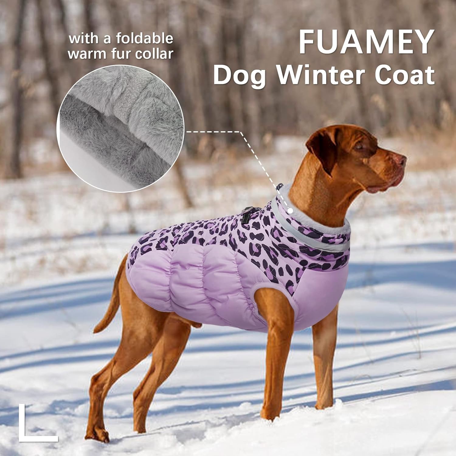FUAMEY Dog Coat for Large Dogs,Waterproof Dog Winter Jacket with Harness Built in Puppy Cold Weather Coats Reflective Pet Vest with Zipper Warm Fleece Dogs Snowsuit Windproof Purple Leopard L