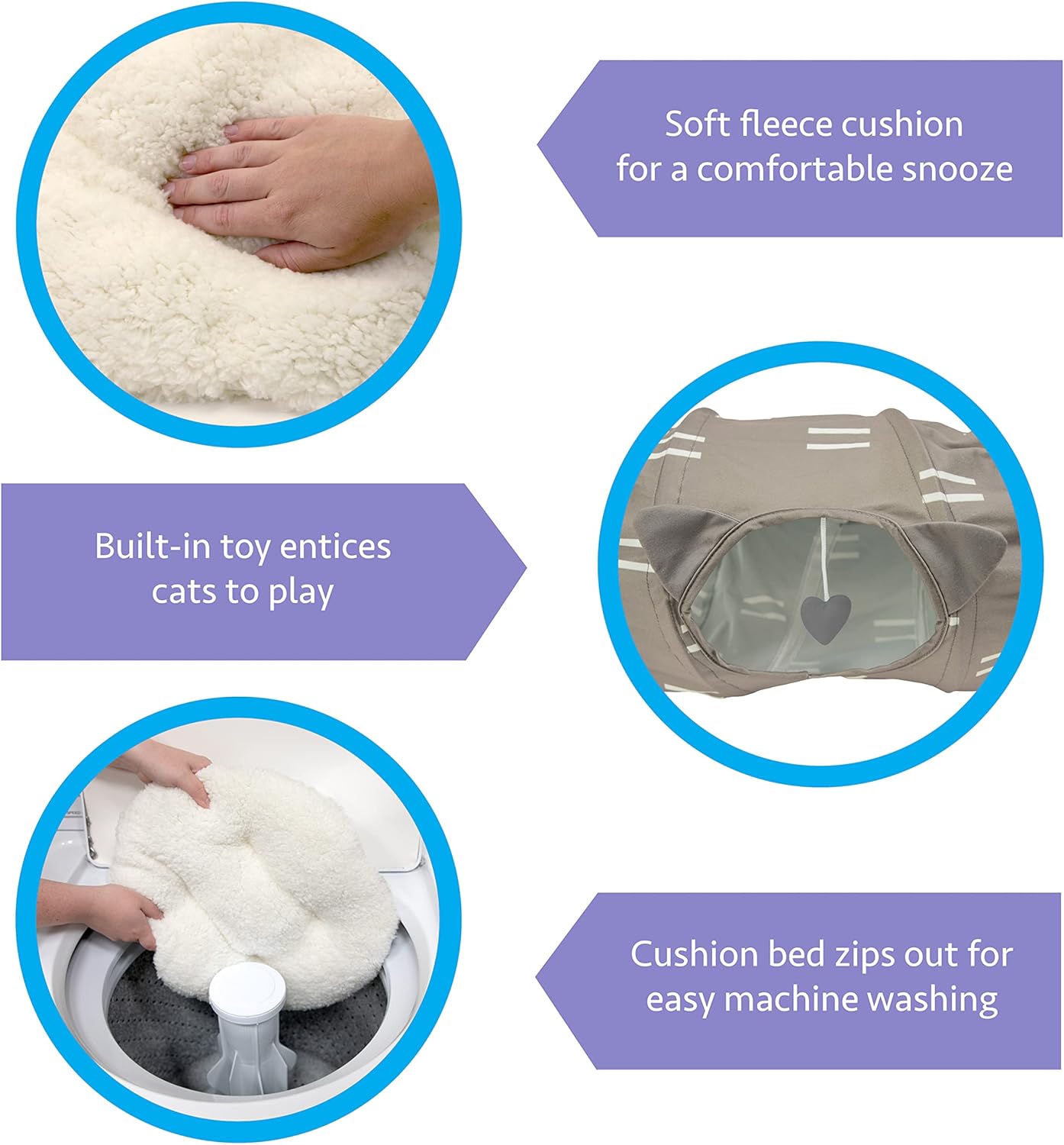 - TUNNEL TIME: With two entrances to pop in and peek out, the tunnel creates a private play space for your cat to hide, dart and pounce away some energy. And built-in hanging toys keep his attention even longer with a bit of swatting fun.