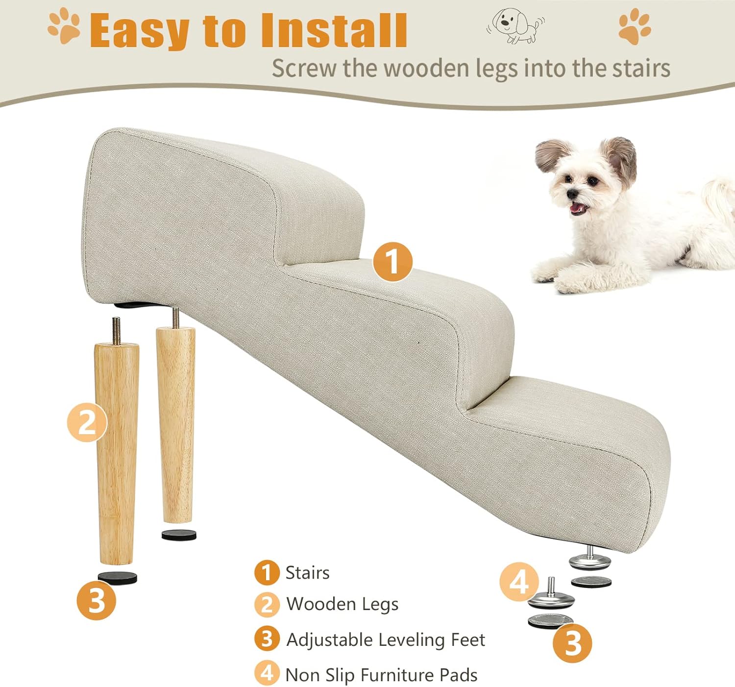 Senneny Imitation Linen Faux Leather Dog Stairs, for Pets up to 150 lbs, Waterproof, Scratch Resistant Pet Steps/Stairs with High Density Foam and Detachable Wooden Legs, Light Beige Linen, 3 Step