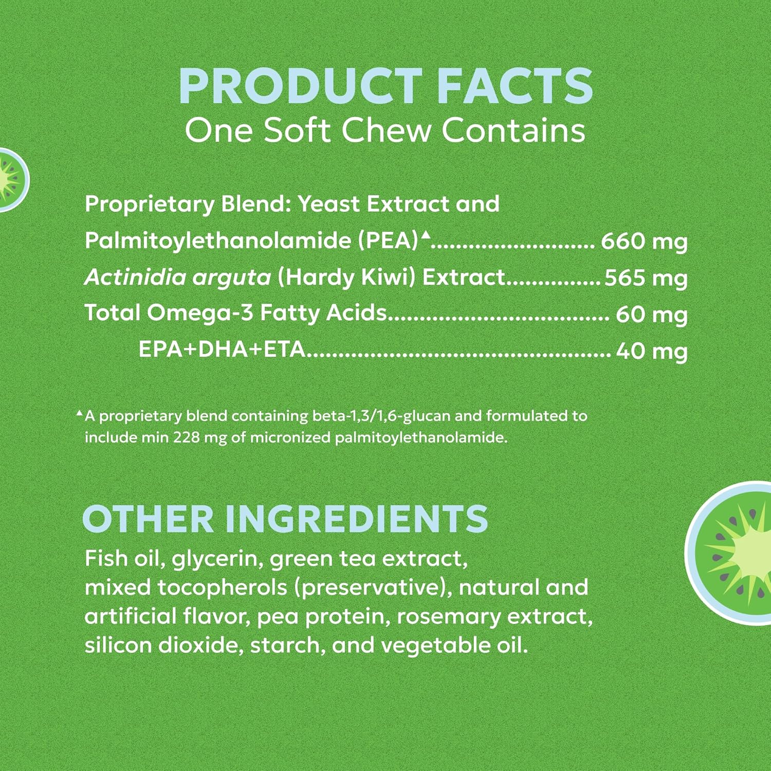 - Active Ingredients : Actinidia arguta (Hardy Kiwi) Extract 160 mg, Proprietary Blend: Yeast and Wheat Extracts* 130 mg, Total Omega-3 Fatty Acids 33 mg, Eicosapentaenoic Acid (EPA) 15 mg, Docosahexaenoic Acid (DHA) 10 mg, Eicosatetraenoic Acid (ETA) 740 mcg, Gamma-linolenic Acid (GLA) 17 mg. *A proprietary blend containing phytoceramides and beta (1,3)/(1,6) glucan MacroGard® Actinidia arguta (Hardy Kiwi) Extract 160 mg, Proprietary Blend: Yeast and Wheat Extracts* 130 mg, Total Omega-3 Fatty Acids 33 mg, Eicosape… See more