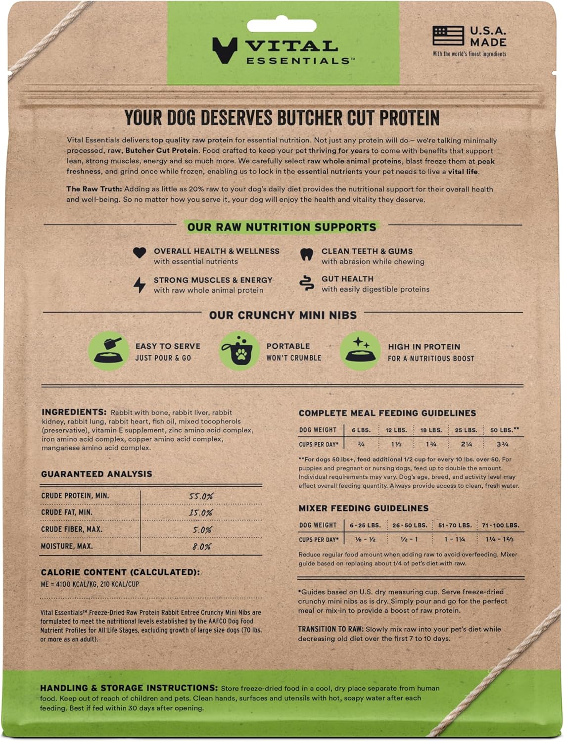 - CRUNCHY FREEZE-DRIED RAW RABBIT DOG FOOD: Vital Essentials Crunchy Freeze Dried Dog Food packs more protein than industry standard into every bite to deliver the peak vitality your dog deserves, especially when compared to dehydrated dog food. This complete and balanced freeze-dried raw dog food is made with premium butcher cut rabbit, responsibly sourced in the EU.