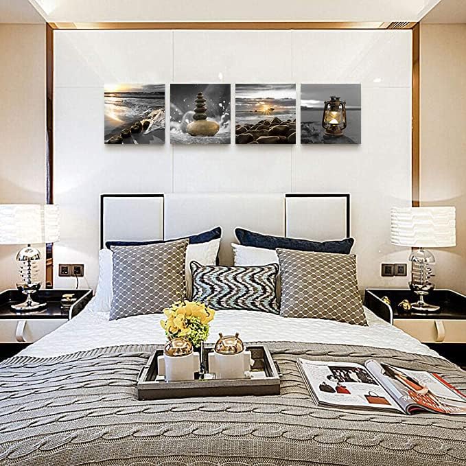 Yxbhhym-Canvas Zen Décor Black and White Beach Wall Art Ocean Poste Seascape Picture Print Sunset Scenery Painting Artwork for Living Room Wall Decor Bedroom Bathroom Wall Home Decorations Framed
